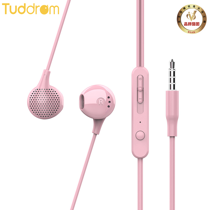 小魔鸭Tuddrom新款粉红色扁头高品质平塞式带唛线控降噪耳机 M01