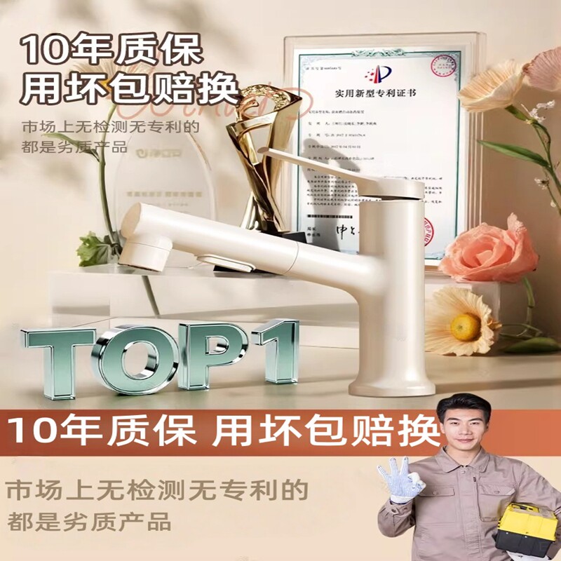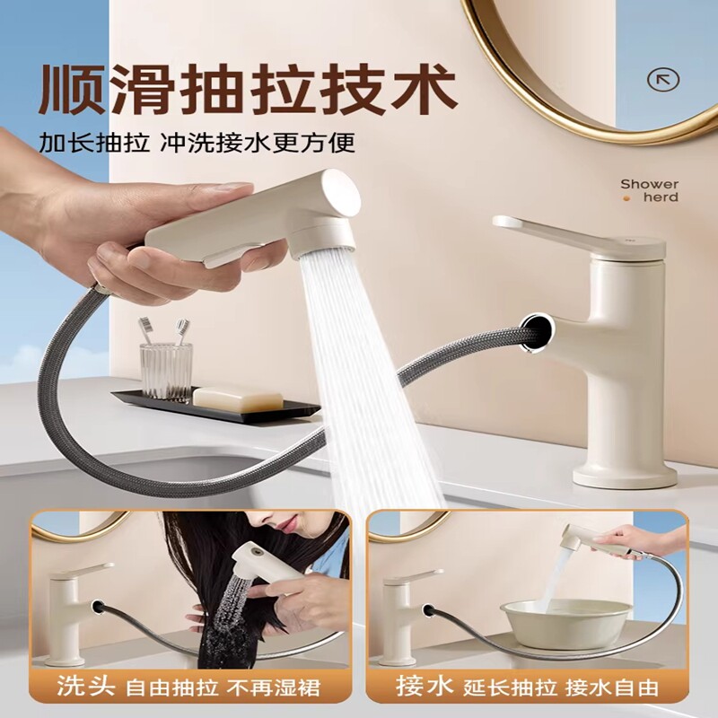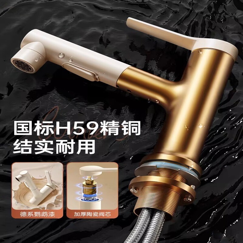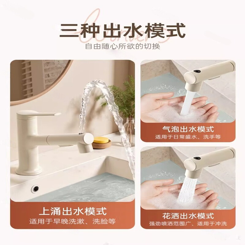 奶油风白色洗脸盆水龙头抽拉式卫生间洗手盆面盆家用冷热水