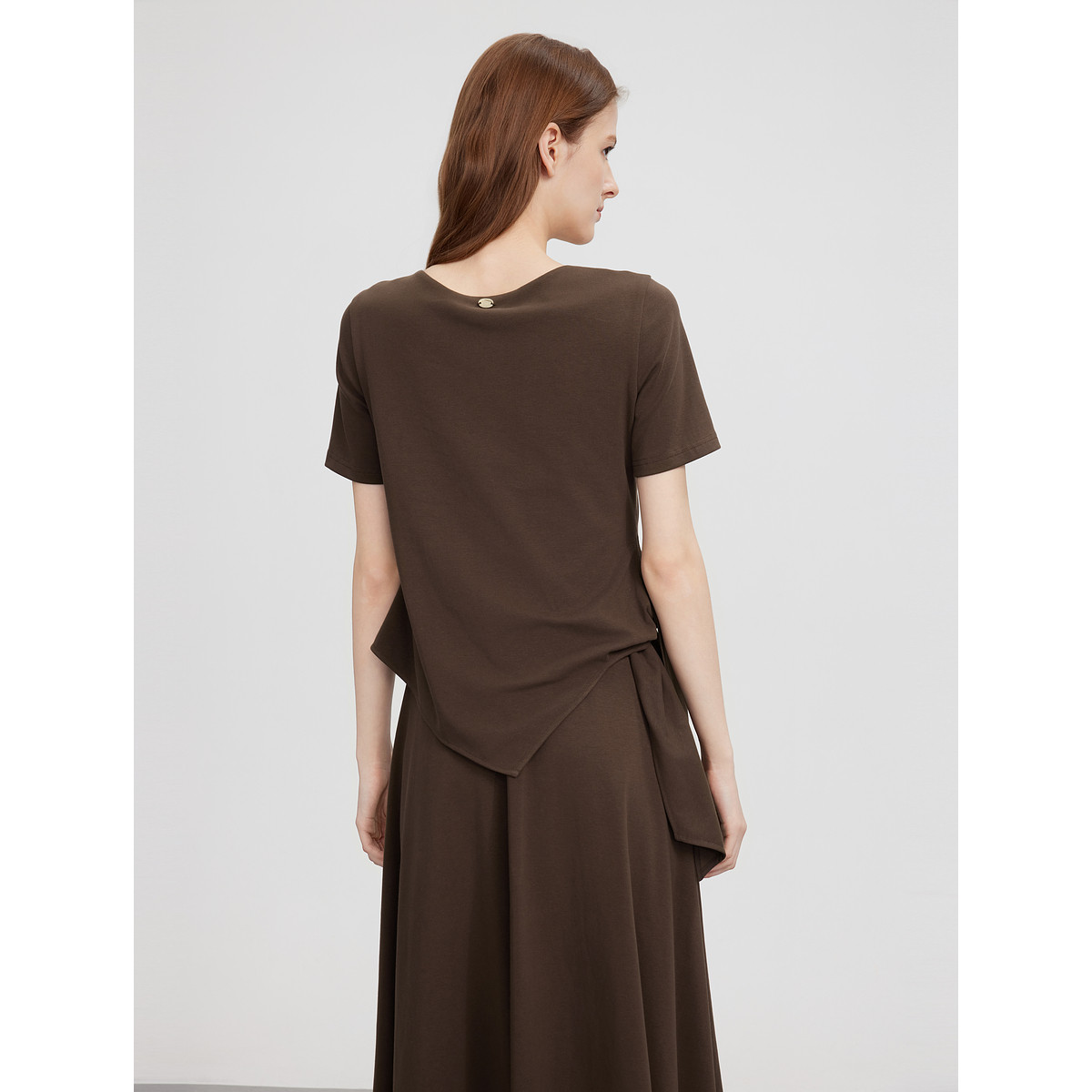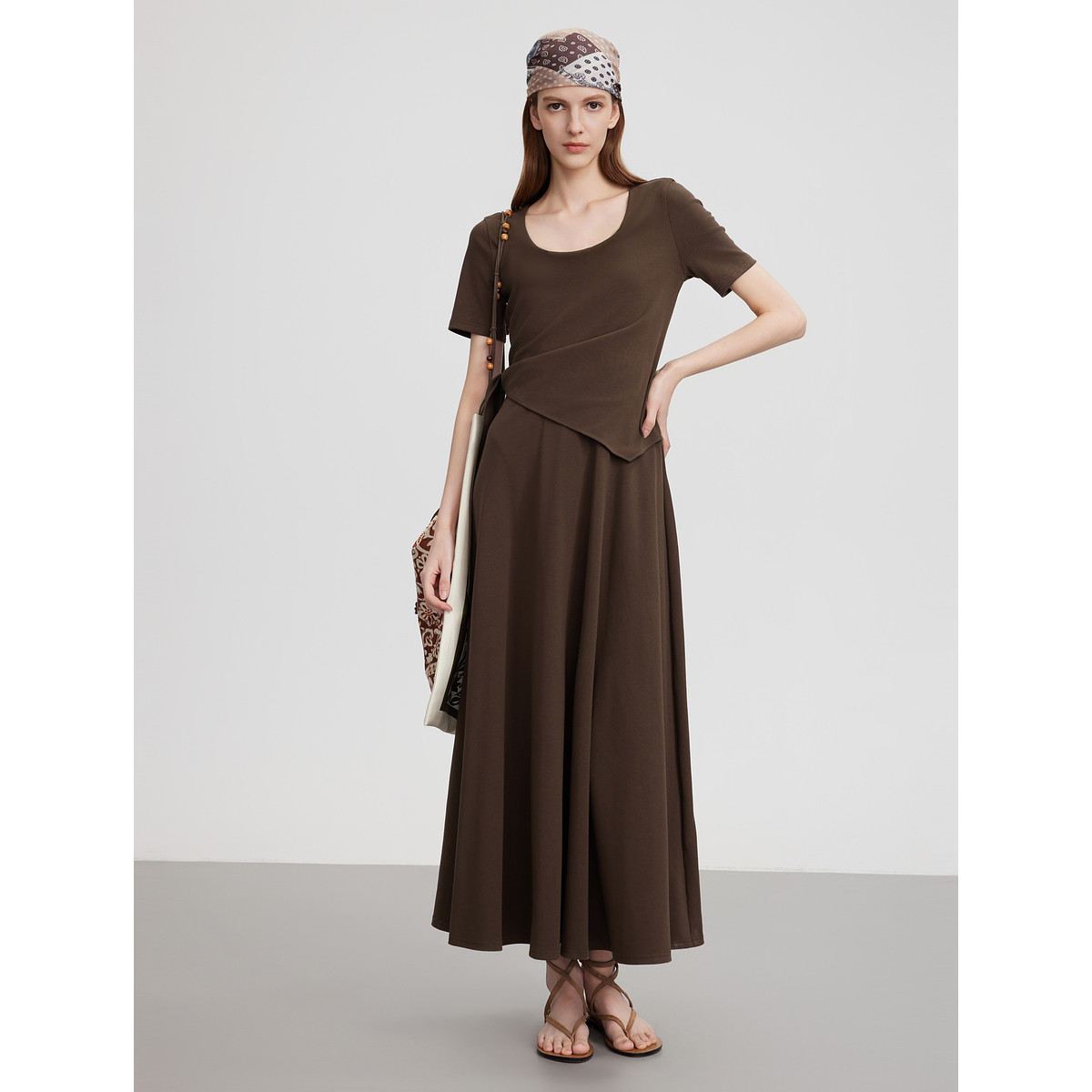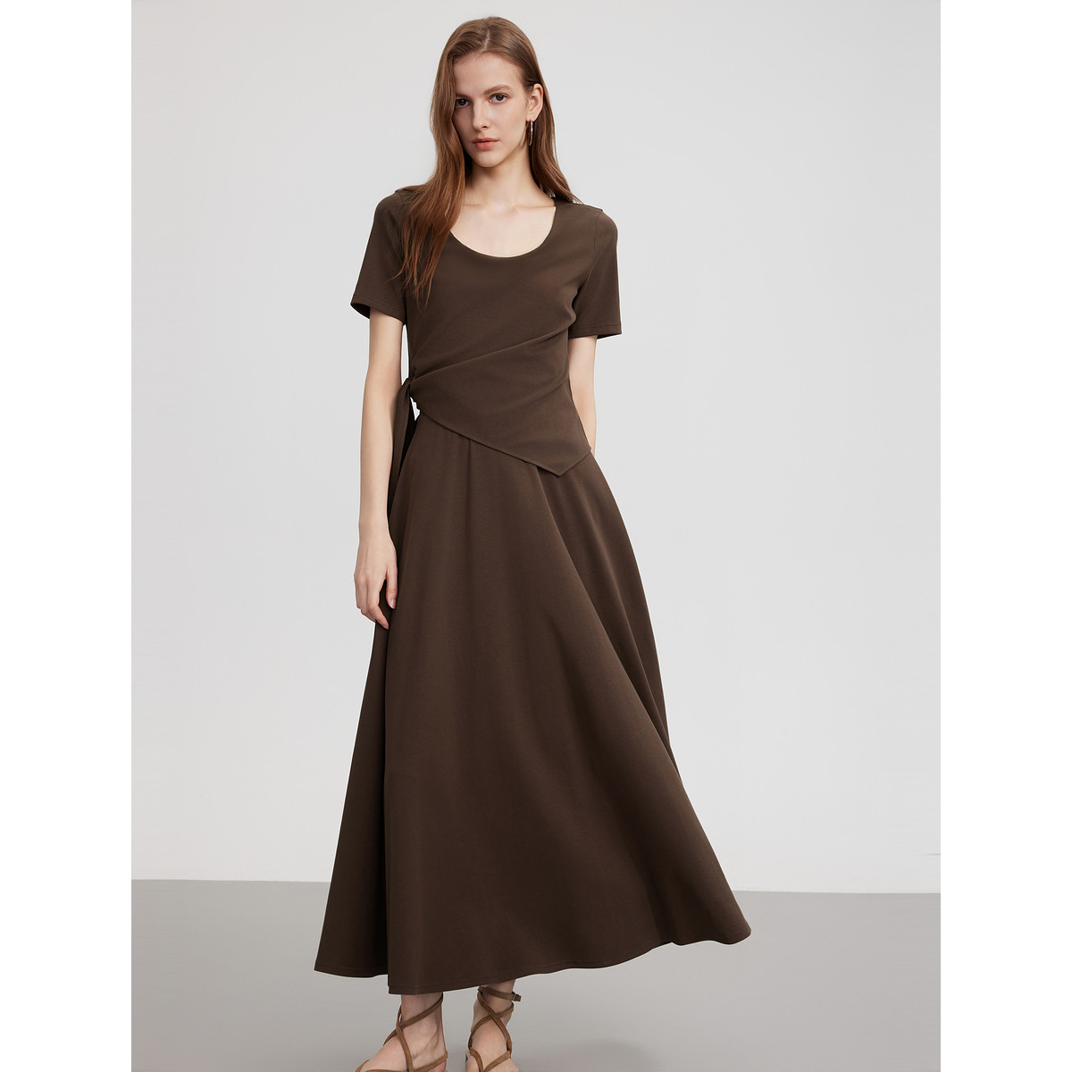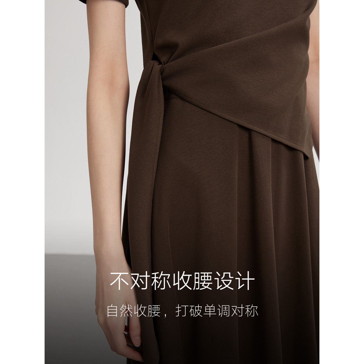 ELLE法式简约不规则连衣裙女2025夏季新款设计感咖色复古收腰长裙