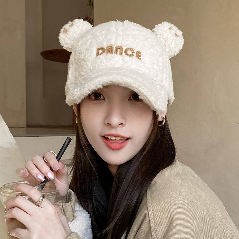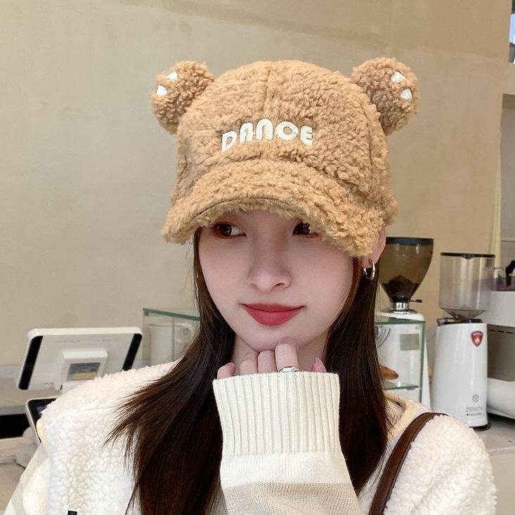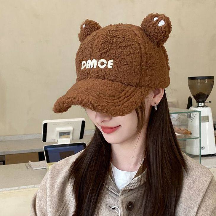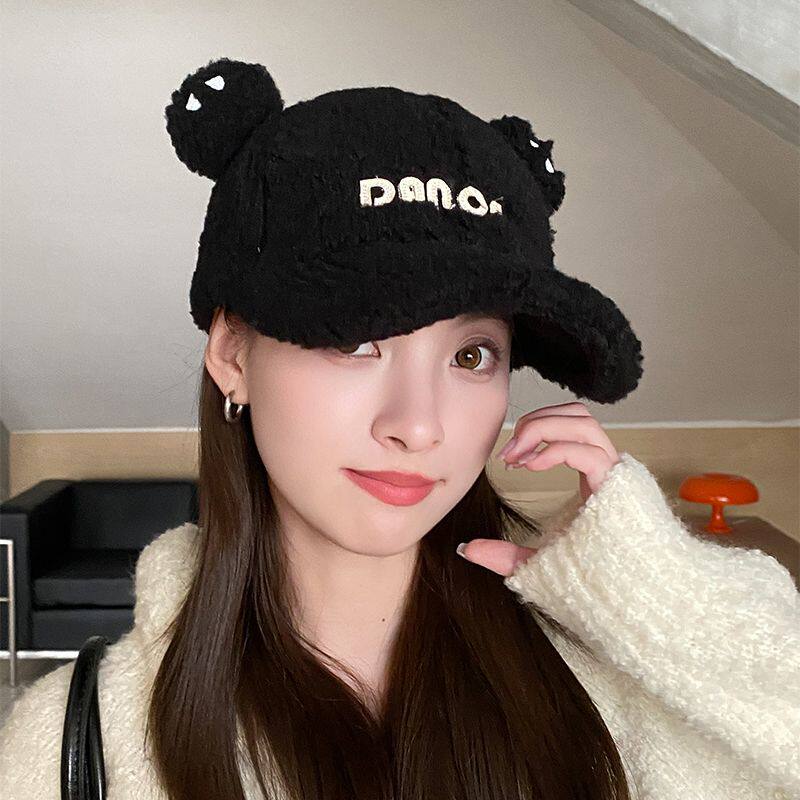 新款毛绒棒球帽子女秋冬季韩版时尚百搭可爱小熊羊羔绒保暖鸭舌帽