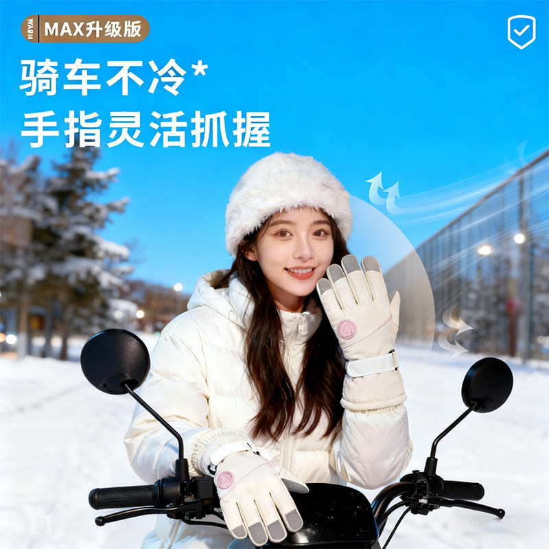 骑行手套冬季女士保暖加厚加绒可触屏东北电动车防寒冬天滑雪手套