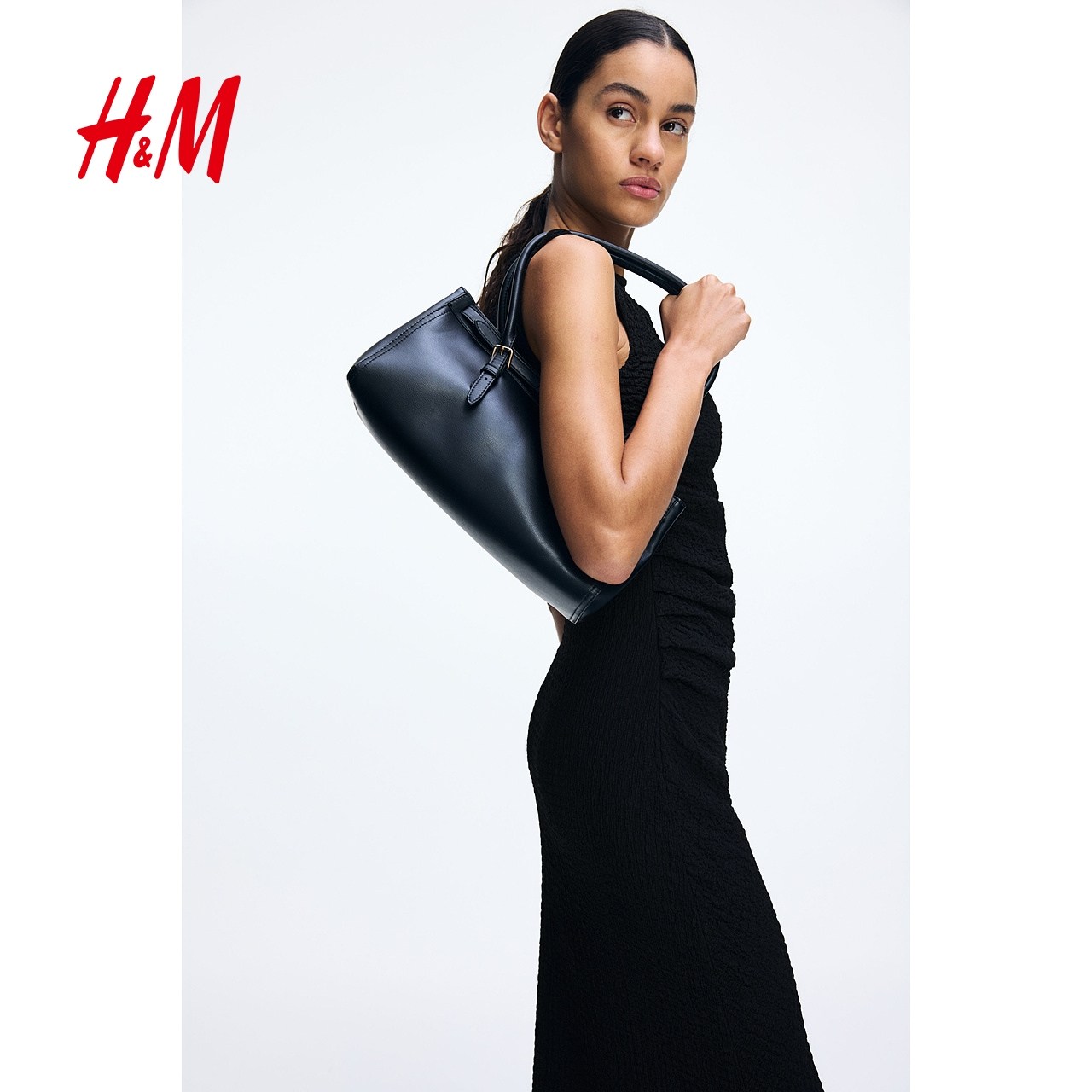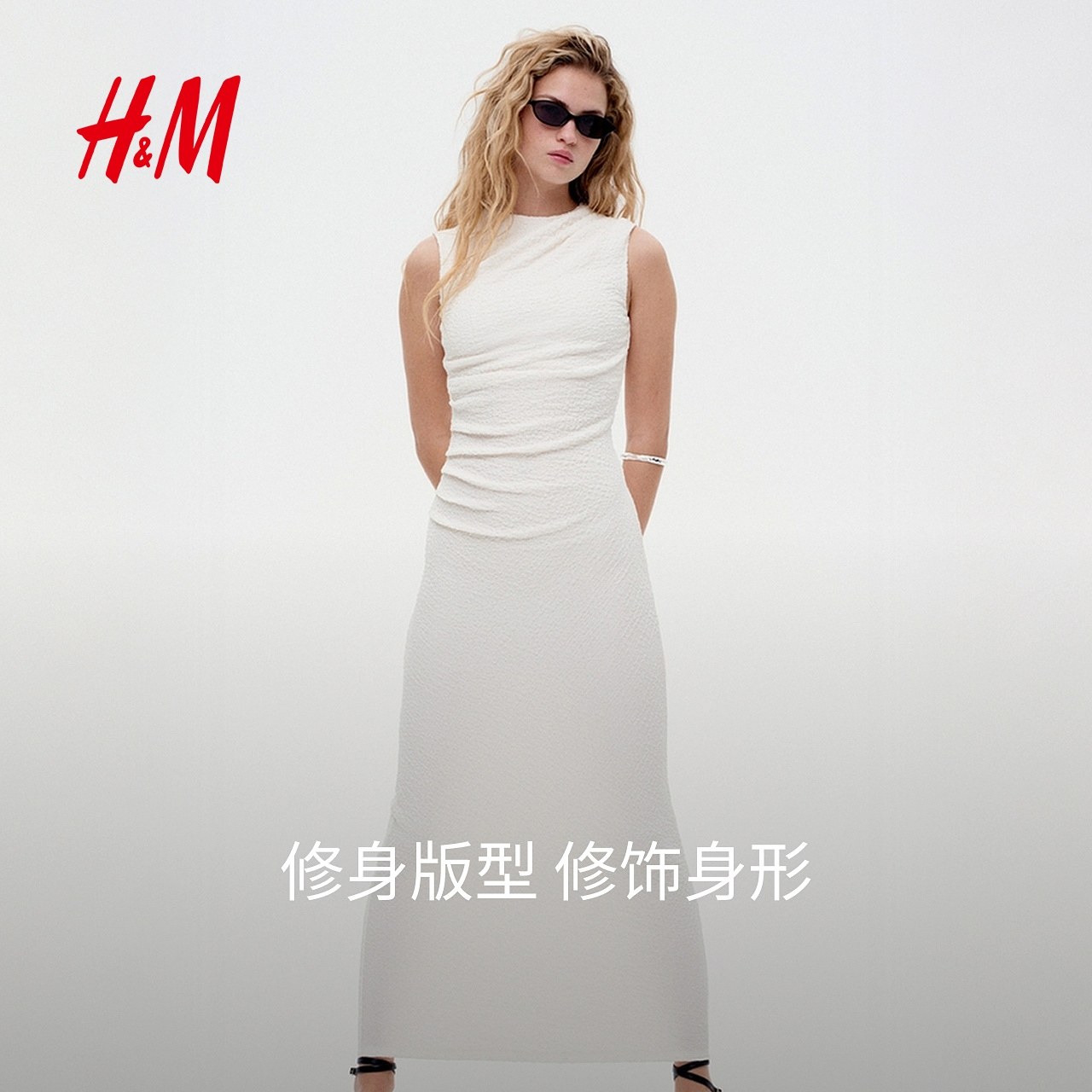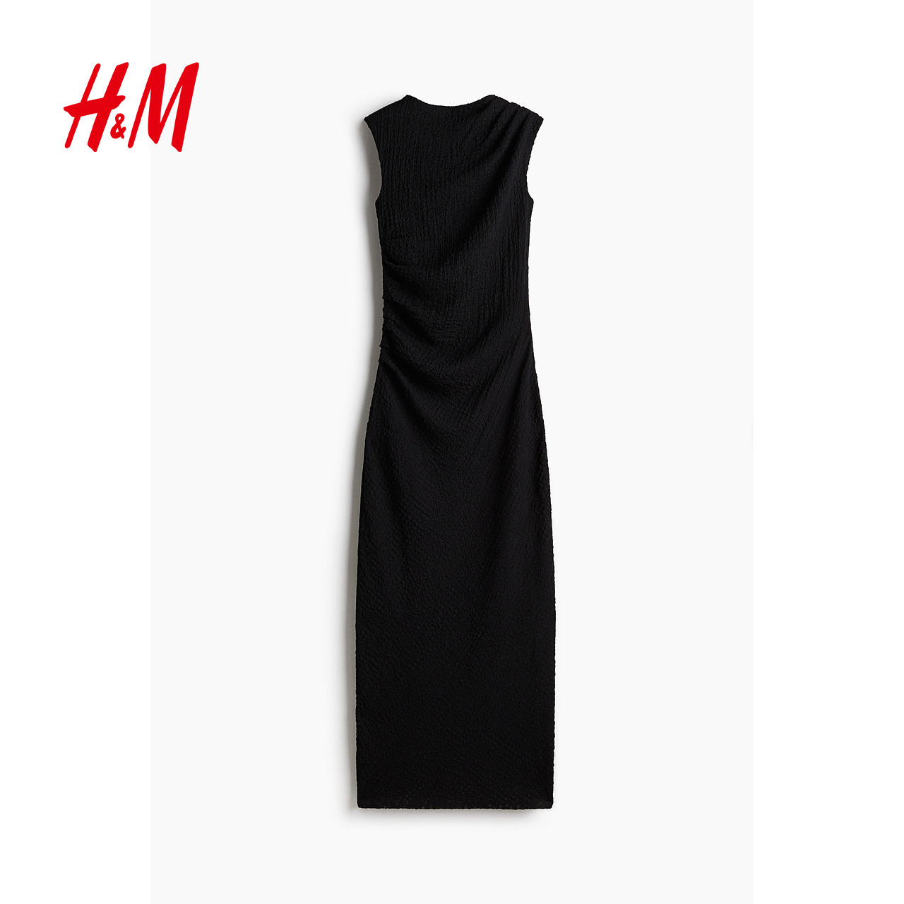 HM女装连衣裙2025冬新款褶皱迷笛裙无袖晚礼服圆领修身裙1268130