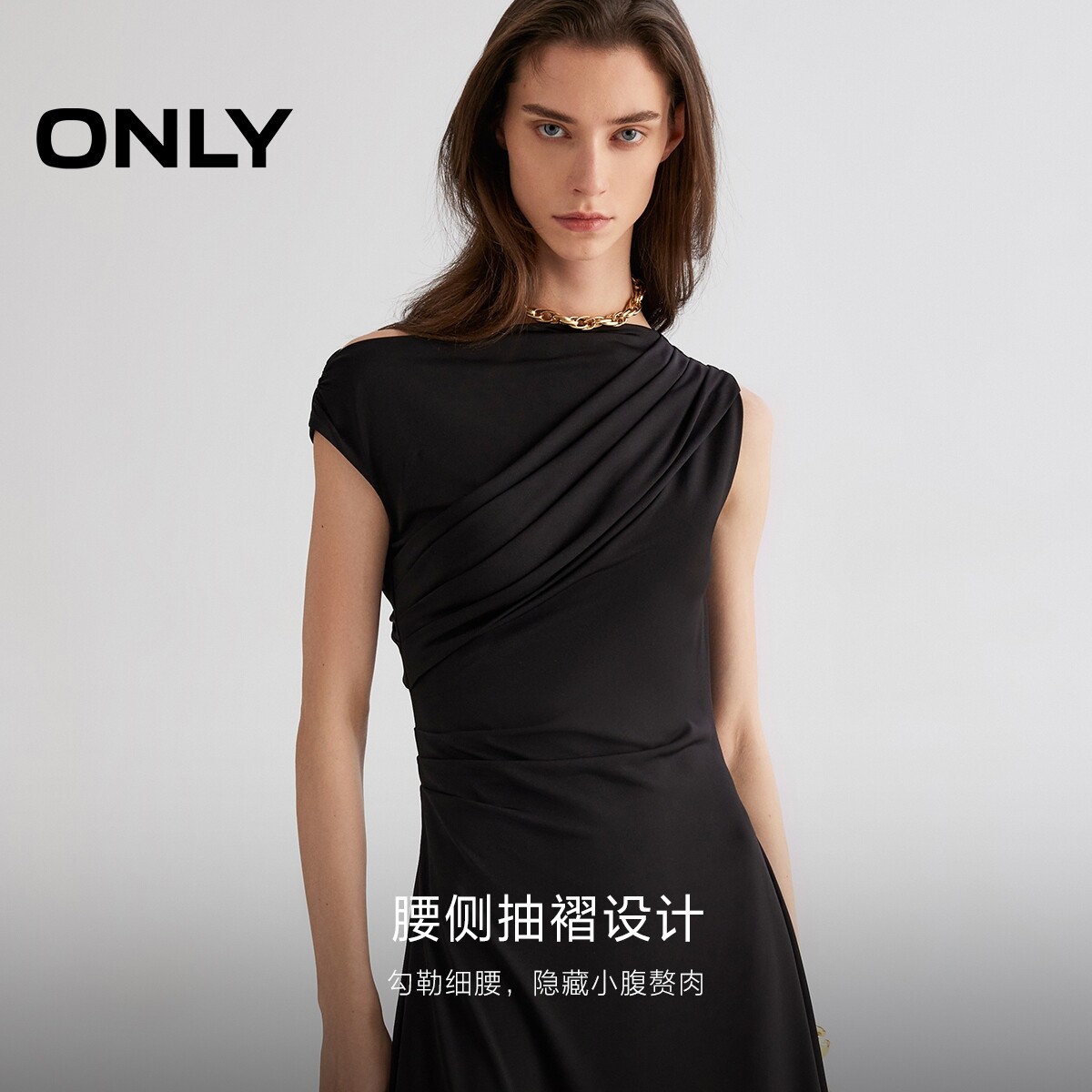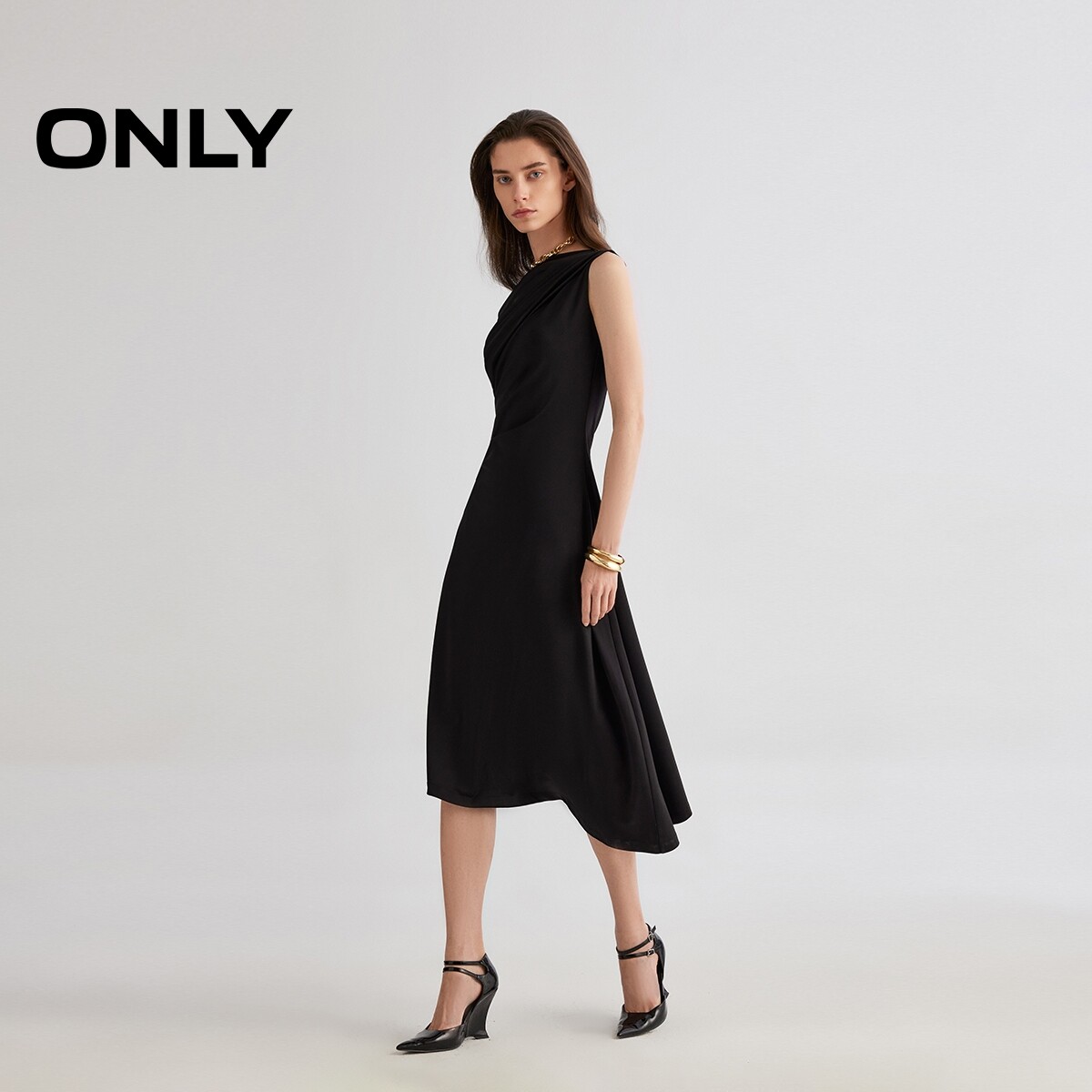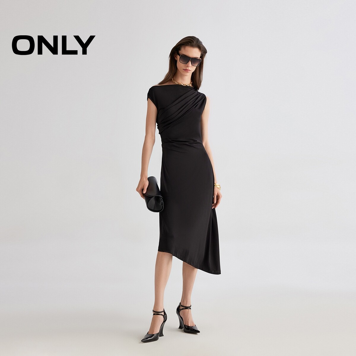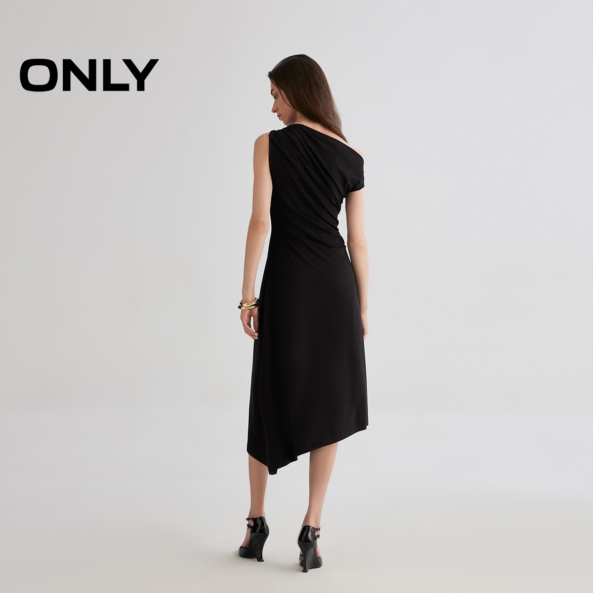 ONLY夏季性感小黑裙不对称斜肩不规则中长款连衣裙女