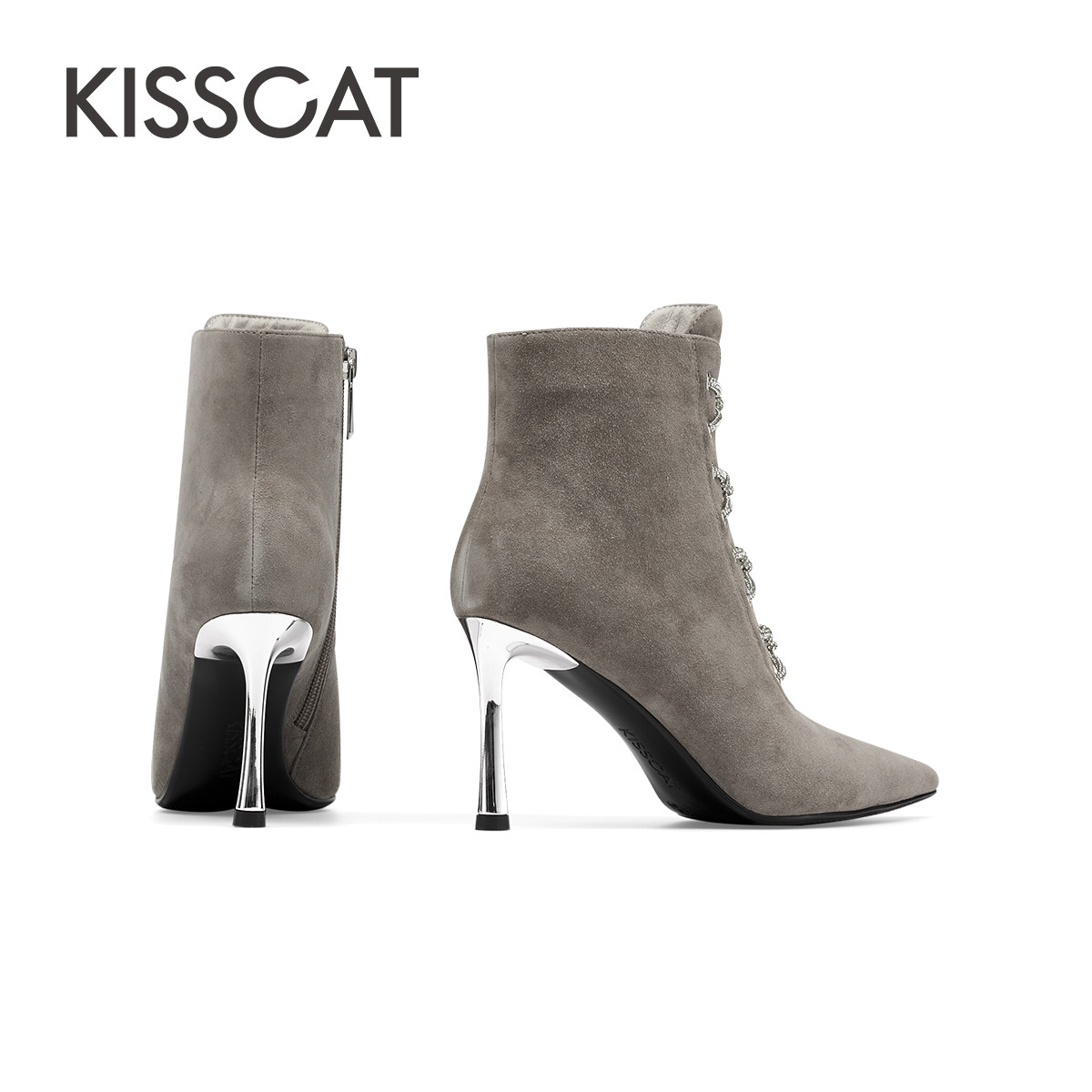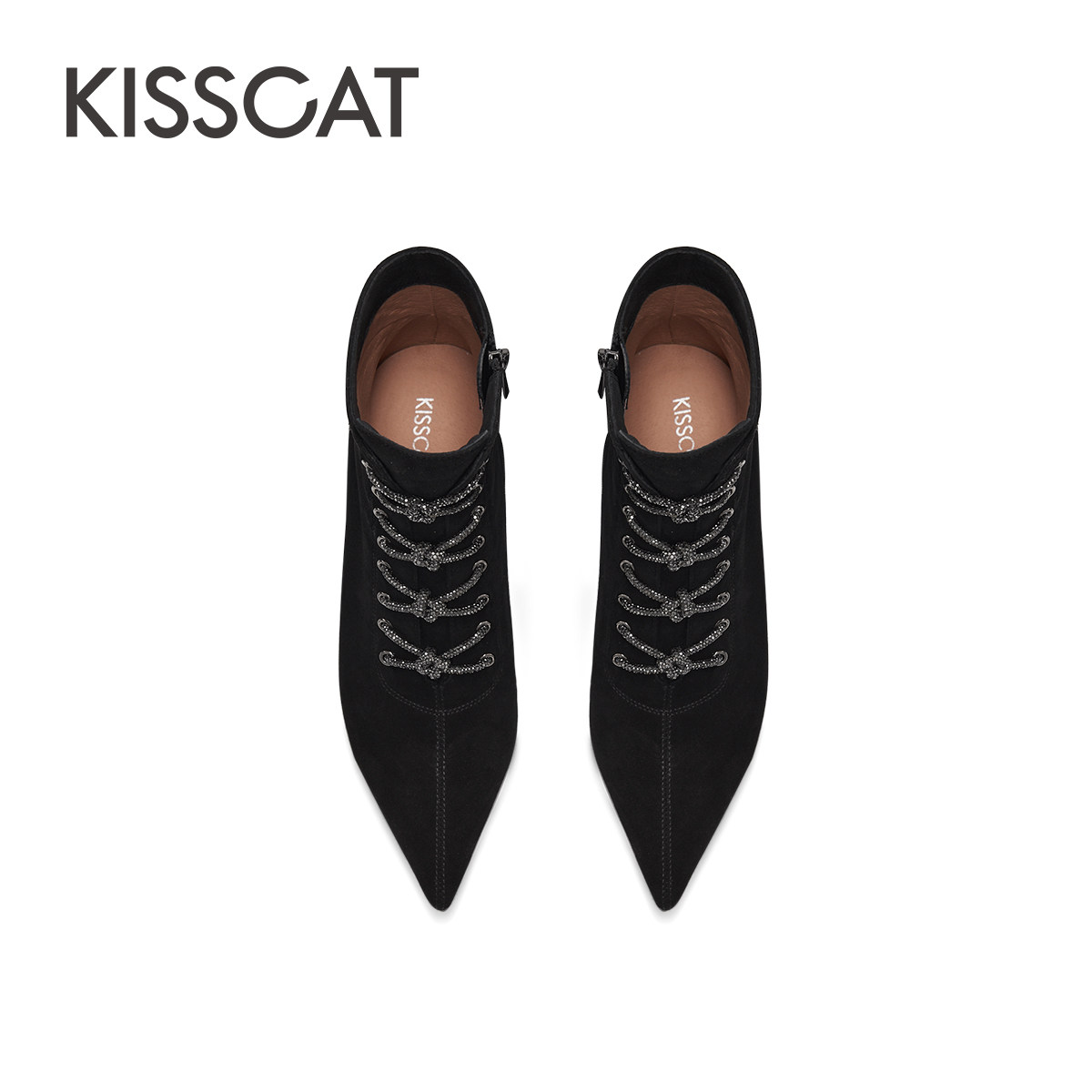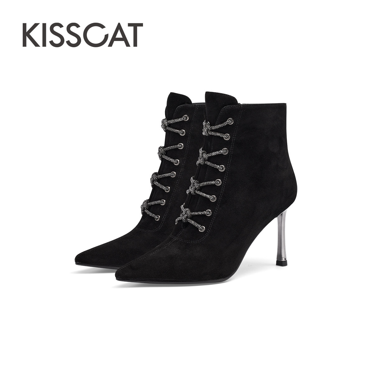 KISSCAT接吻猫春季尖头黑色高跟靴女细跟系带时装靴女通勤短靴子