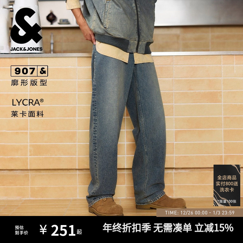 907杰克琼斯男装秋季复古莱卡宽松廓形美式黄泥男士牛仔裤长裤子