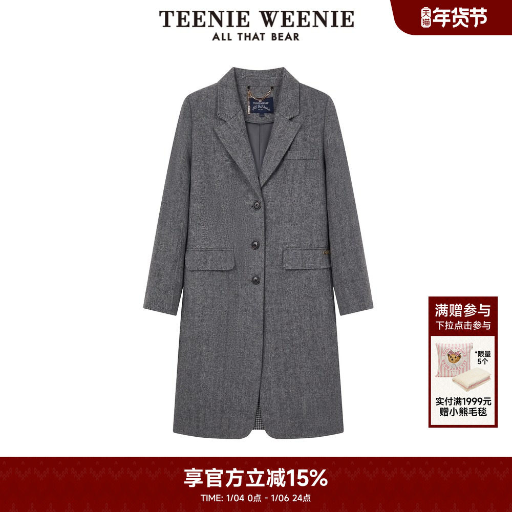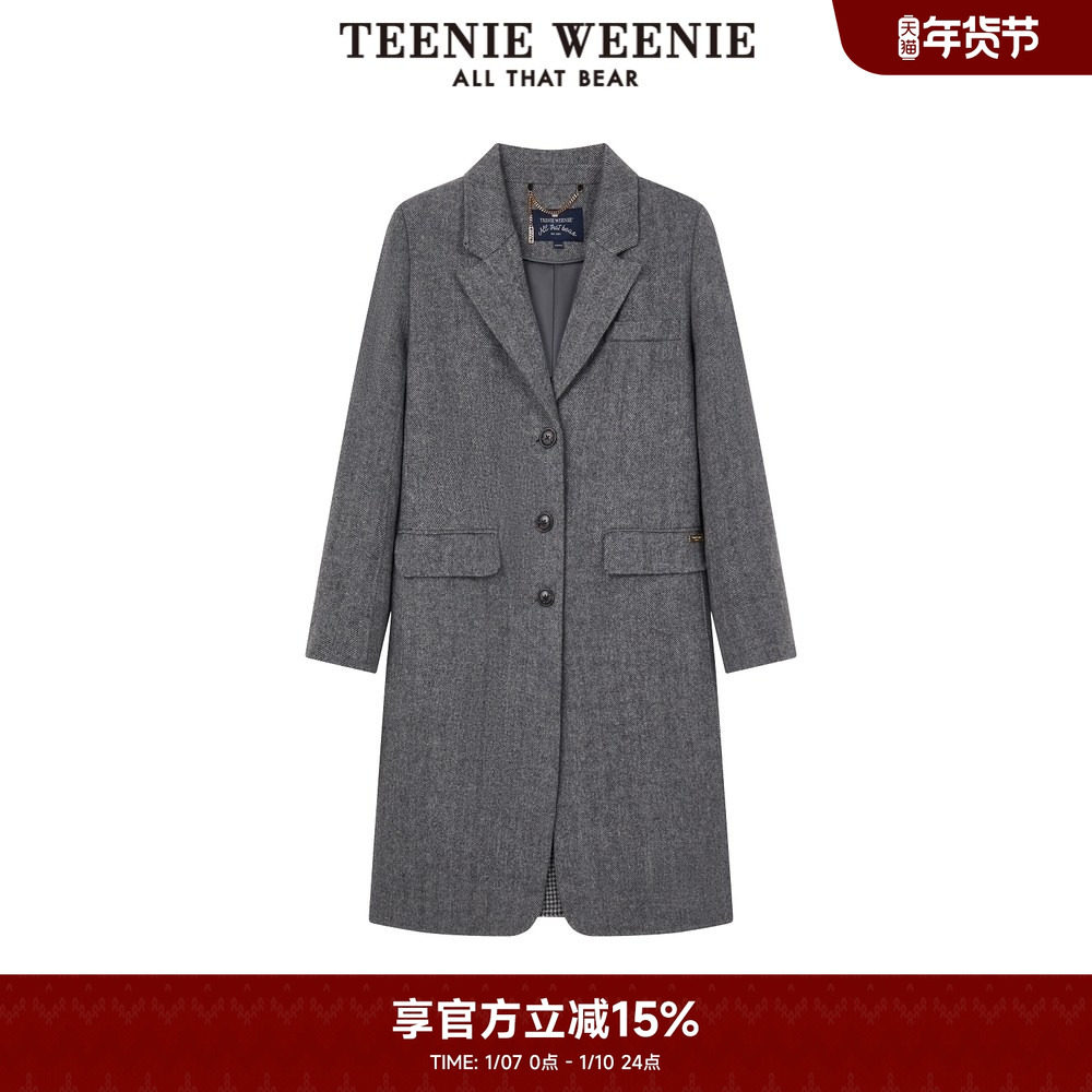 TeenieWeenie小熊奥莱西装领毛呢大衣冬季静奢风直筒中长款外套女