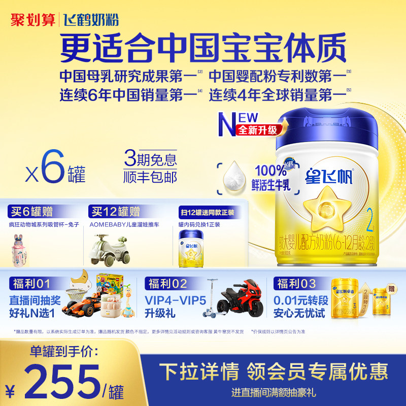 【官方正品】飞鹤星飞帆2段婴幼儿配方牛奶粉900g*6罐5HMO专利OPO