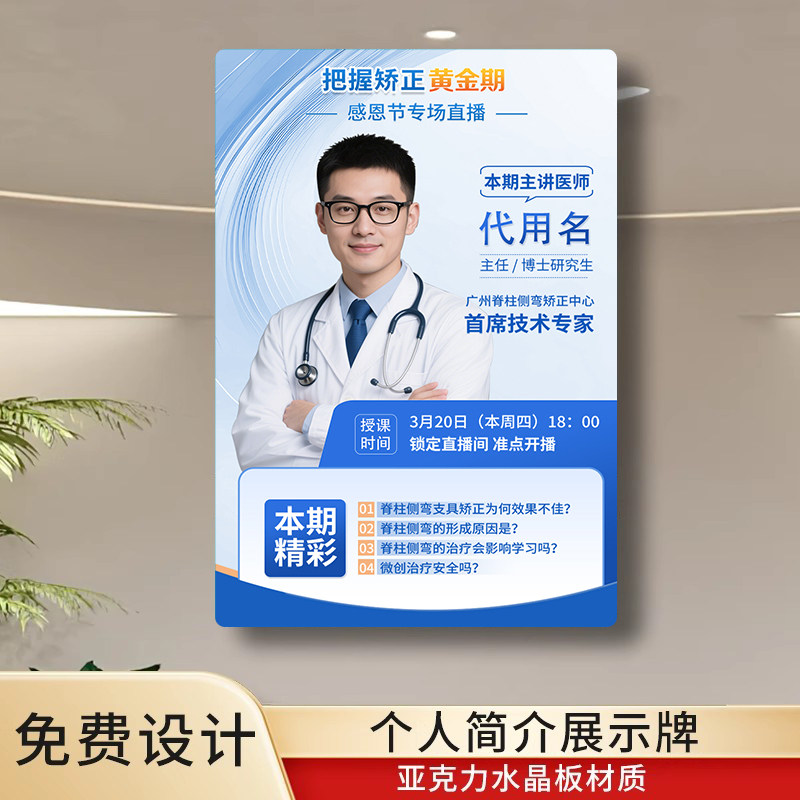 亚克力医生个人简介形象广告展示牌定制高档简历展板美容理发口腔牙科医生美业纹绣企业教师培训讲师履历挂墙