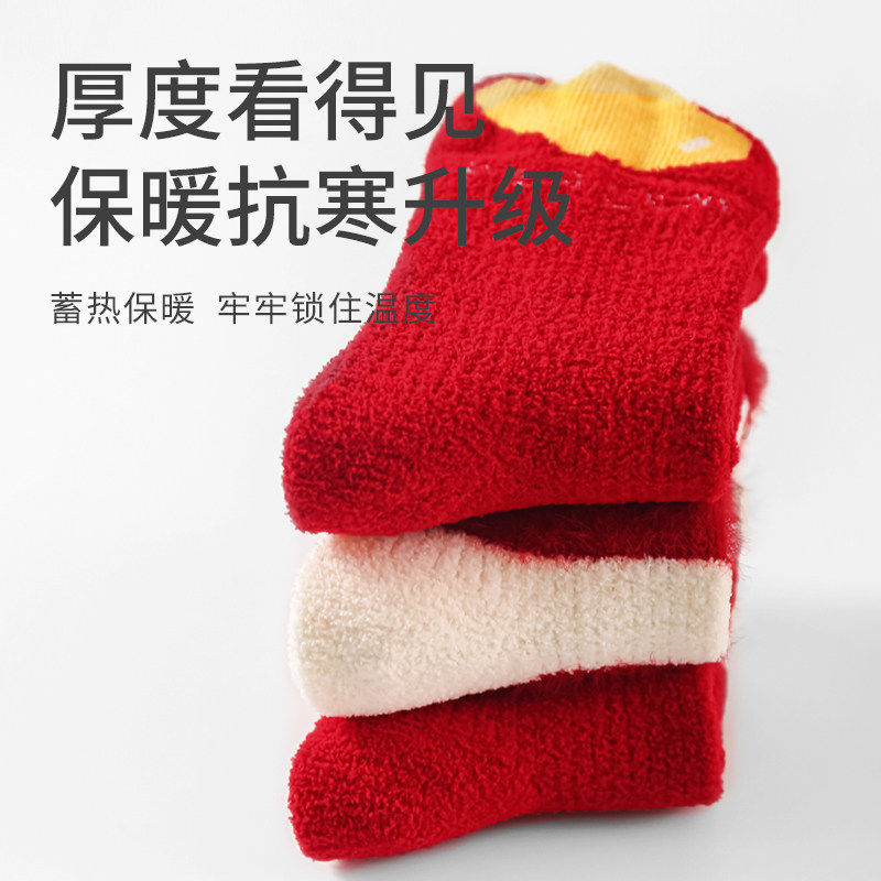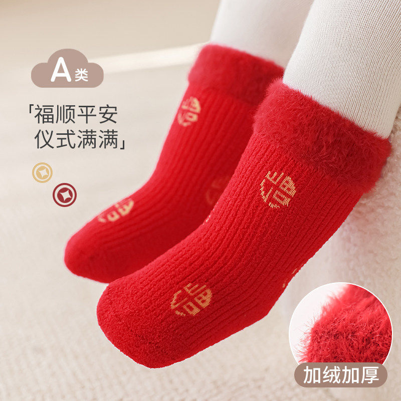 新生婴儿红色袜子宝宝秋冬季加厚加绒保暖百天周岁满月棉袜中筒