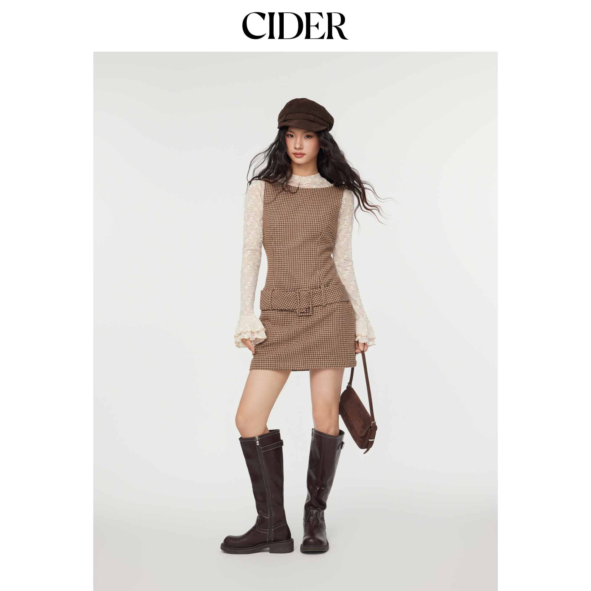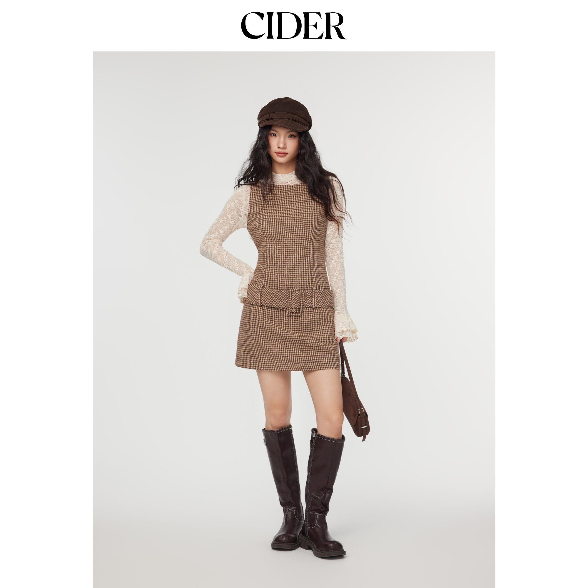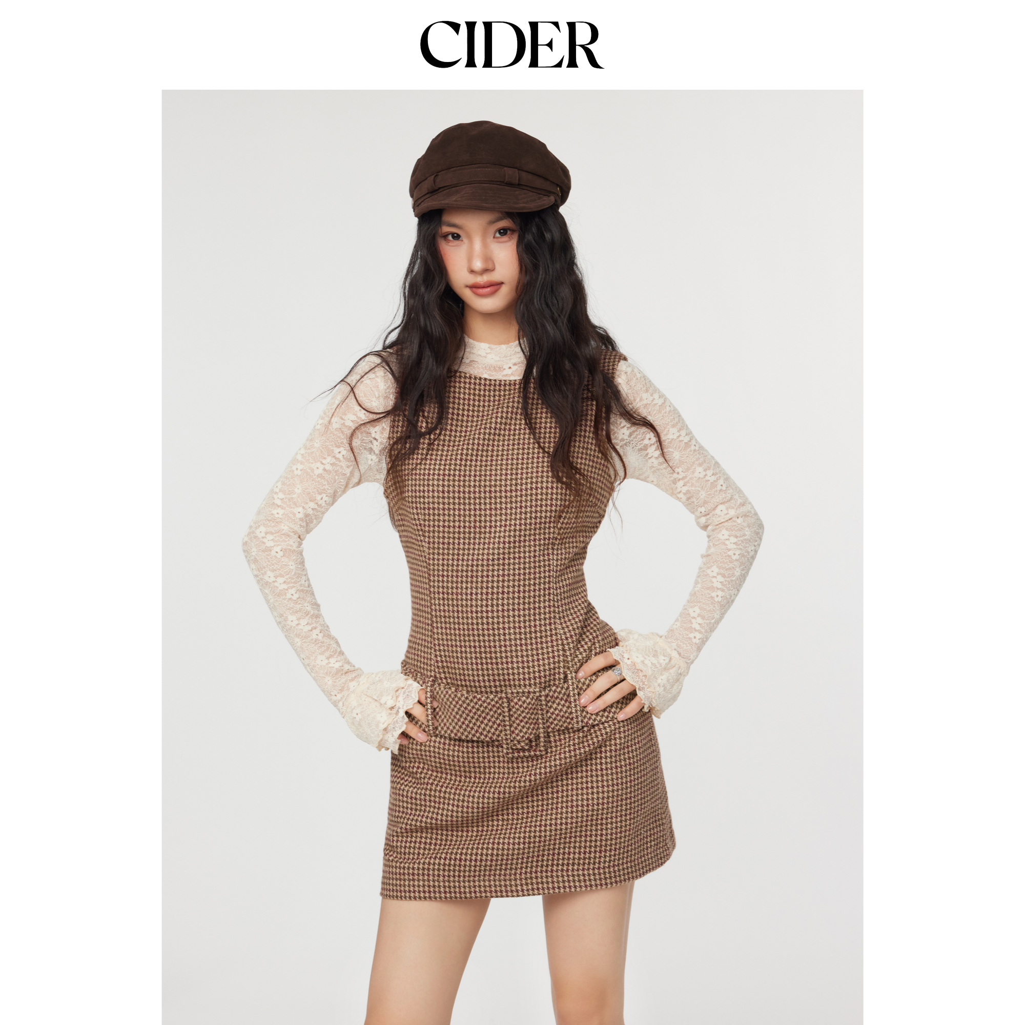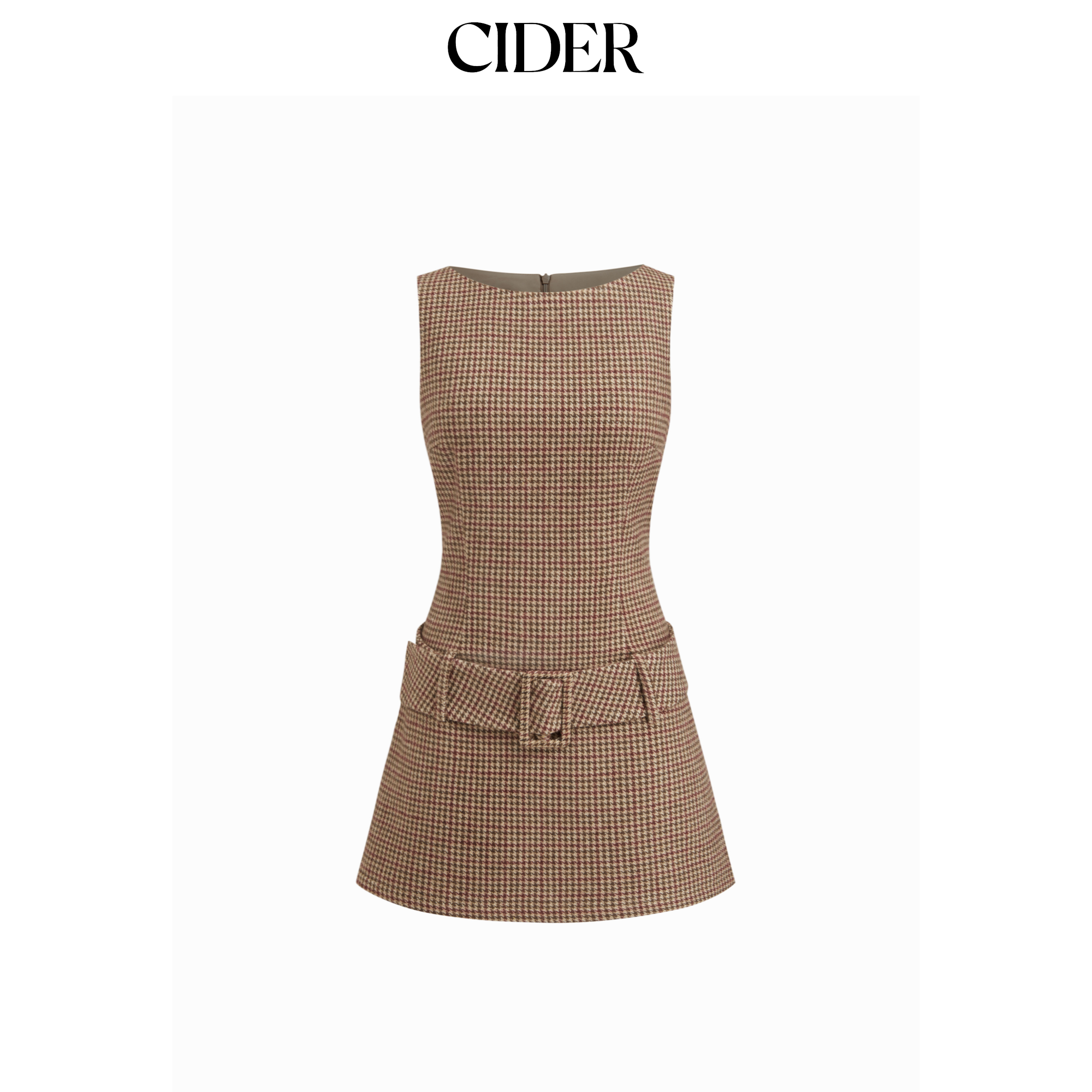 CIDER船领格纹无袖棕色短款千鸟格美式复古连衣裙114792418