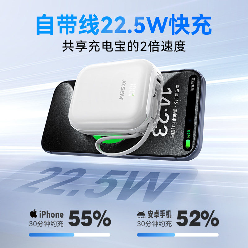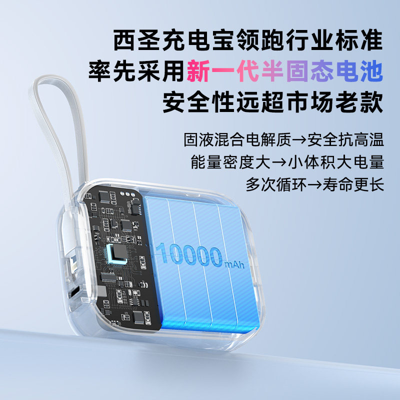 【3C认证半固态电芯】西圣PBS充电宝便携移动电源22.5W快充自带线适用Lightning苹果typec安卓接口