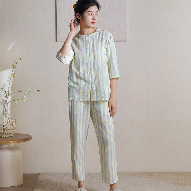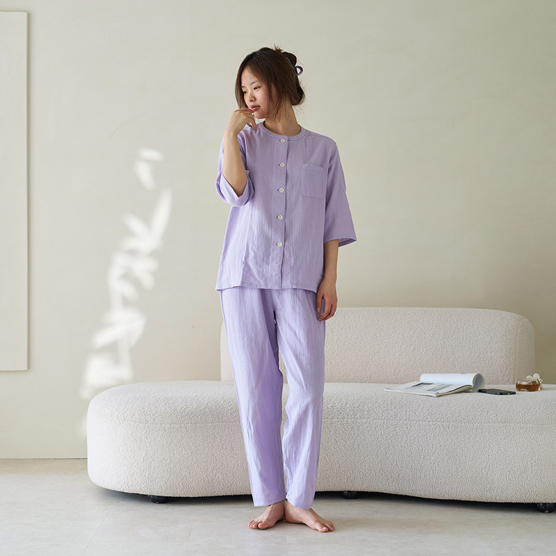 男女无印夏季家居服睡衣A类双层纱良品纯棉全棉休闲短袖可外穿