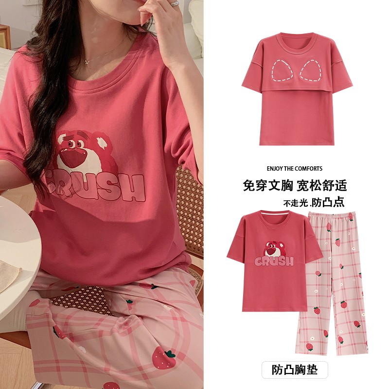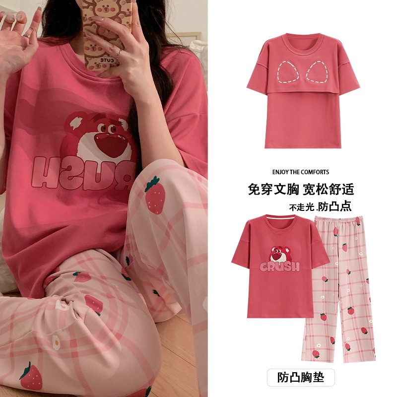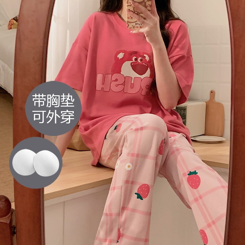 2025带胸垫夏季睡衣女新款短袖长裤熊猫可爱薄款家居服套装可外穿