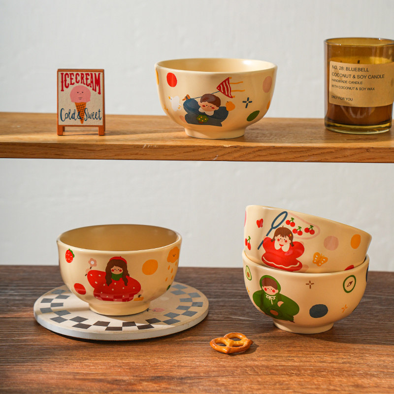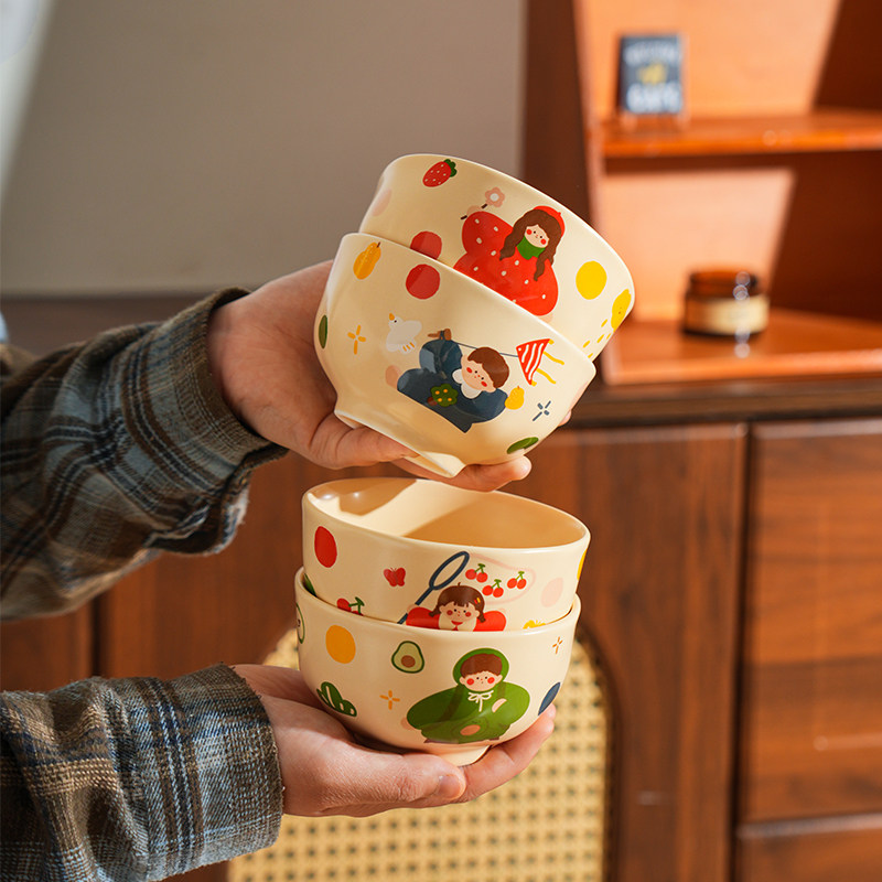 奶油风陶瓷碗家用卡通菜盘子可爱米饭碗汤碗釉下彩儿童餐具耐高温