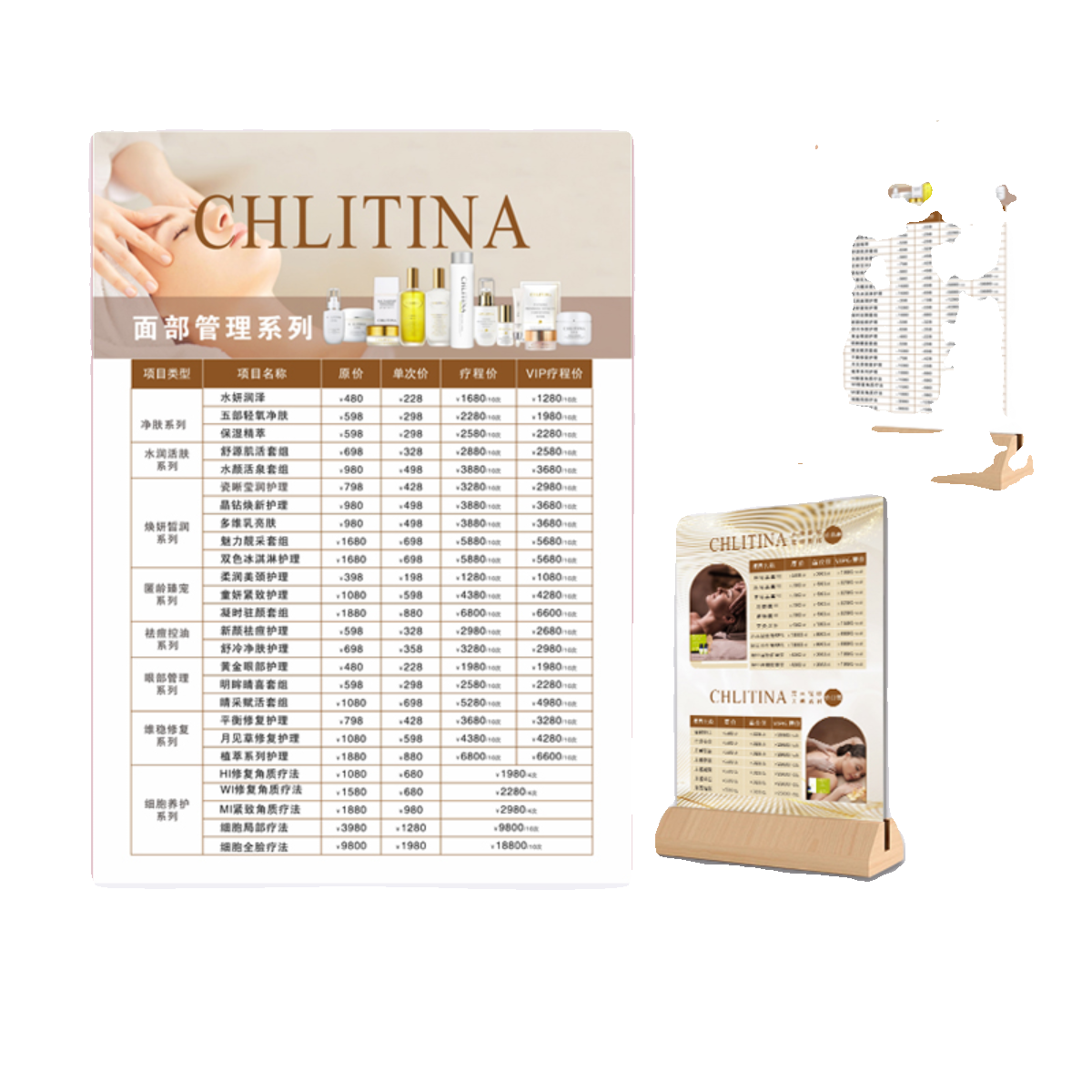 克丽缇娜美容院面部身体护理价目表皮肤管理项目价格台卡双面印刷