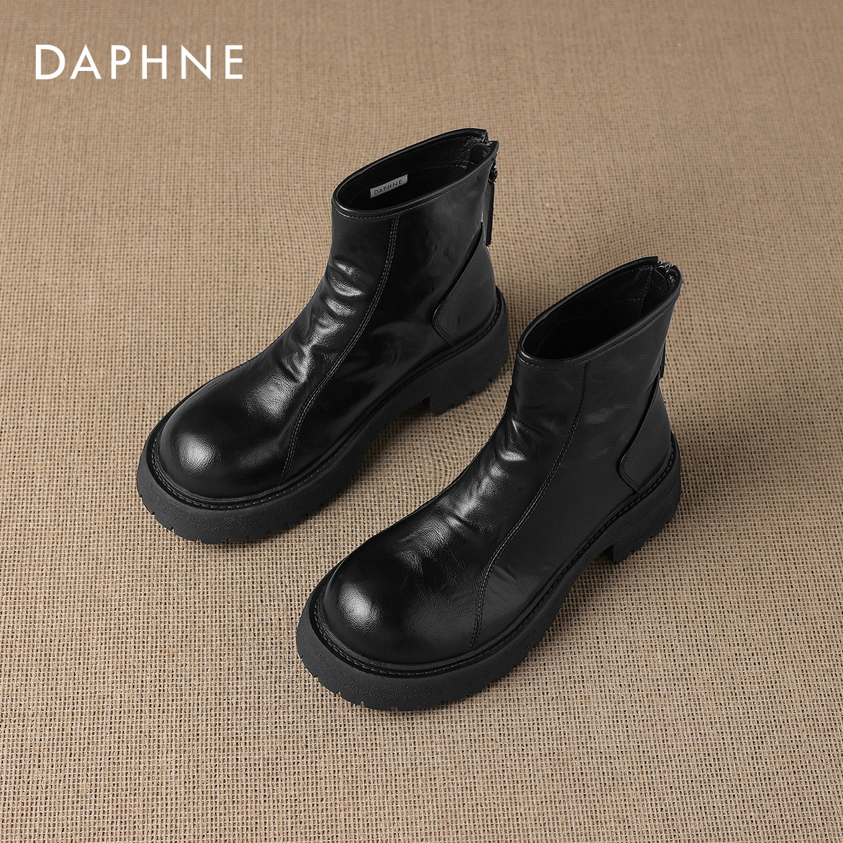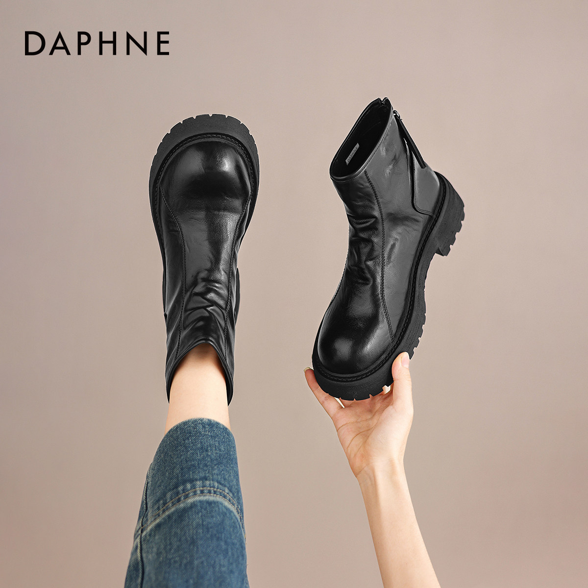 达芙妮短靴女款2026新款英伦风厚底马丁靴加绒平底瘦瘦靴黑色靴子