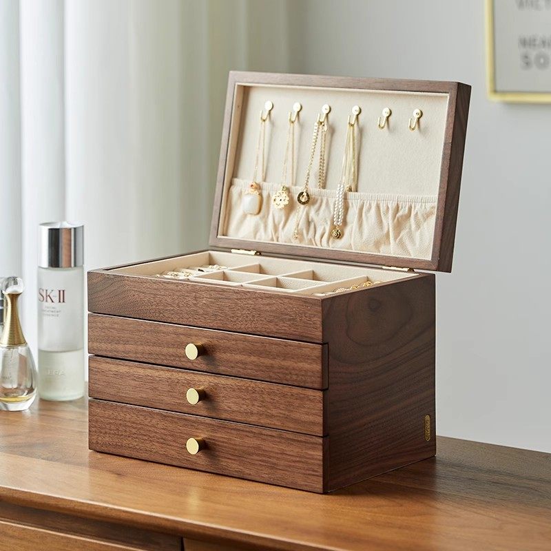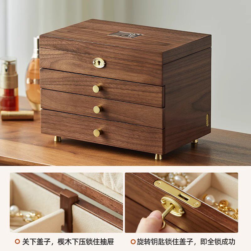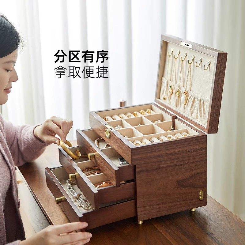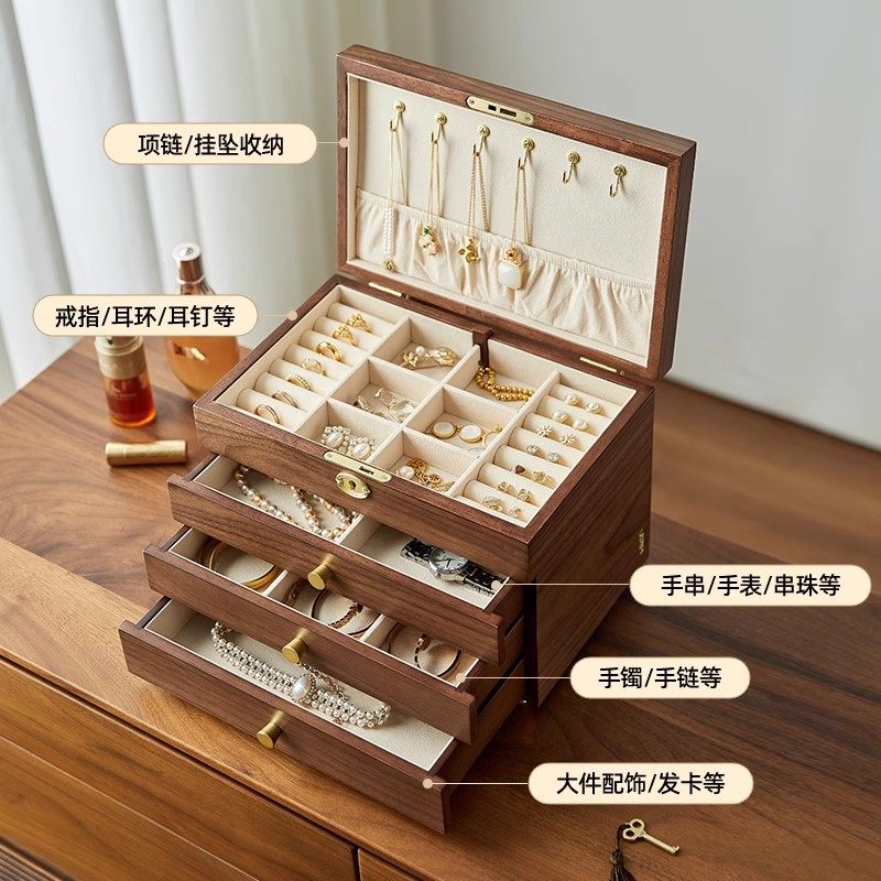 新款实木带锁首饰盒耳钉耳环项链手饰品多层收纳盒高档精致珠宝盒