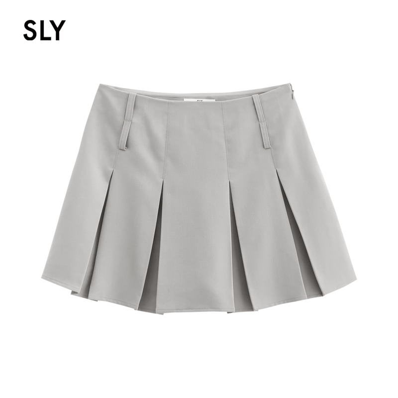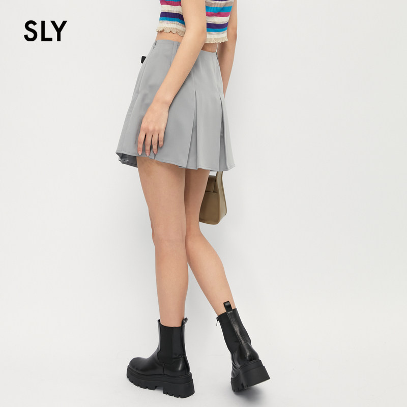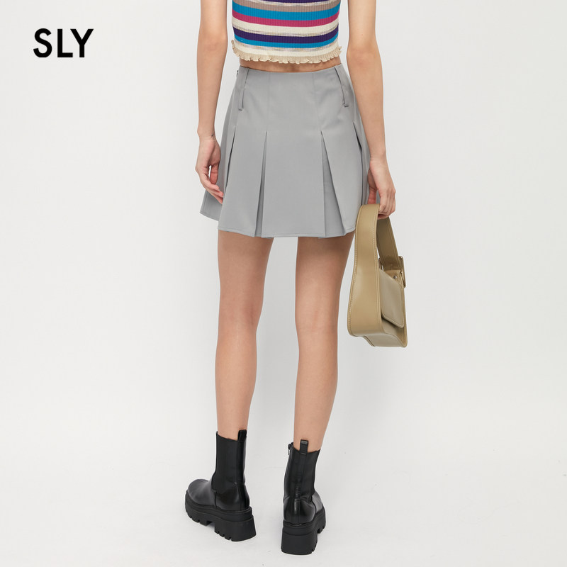 SLY秋季新品学院风双裤袢高腰A字百褶半身裙女038GSU31-5900