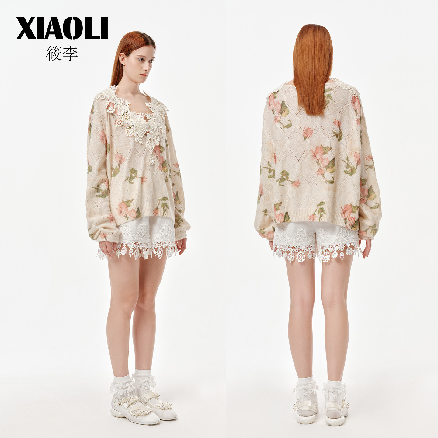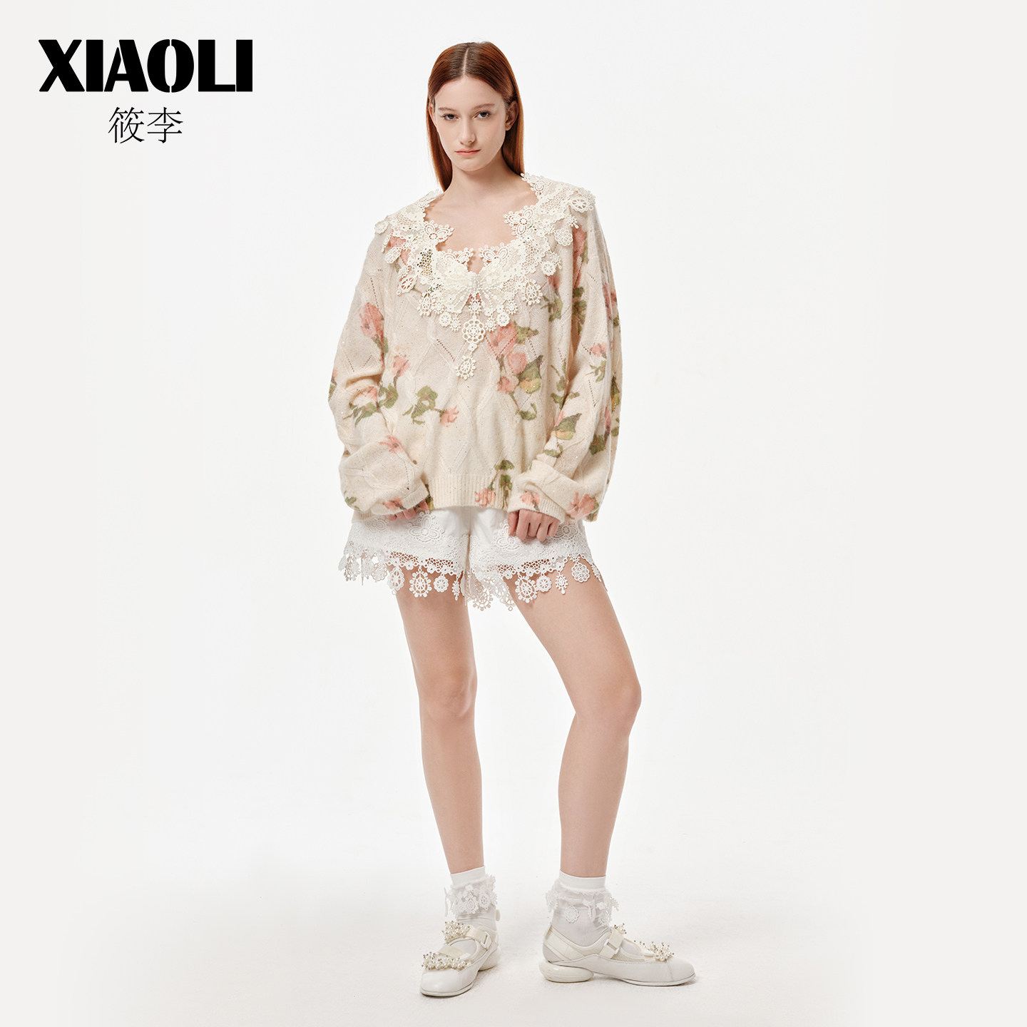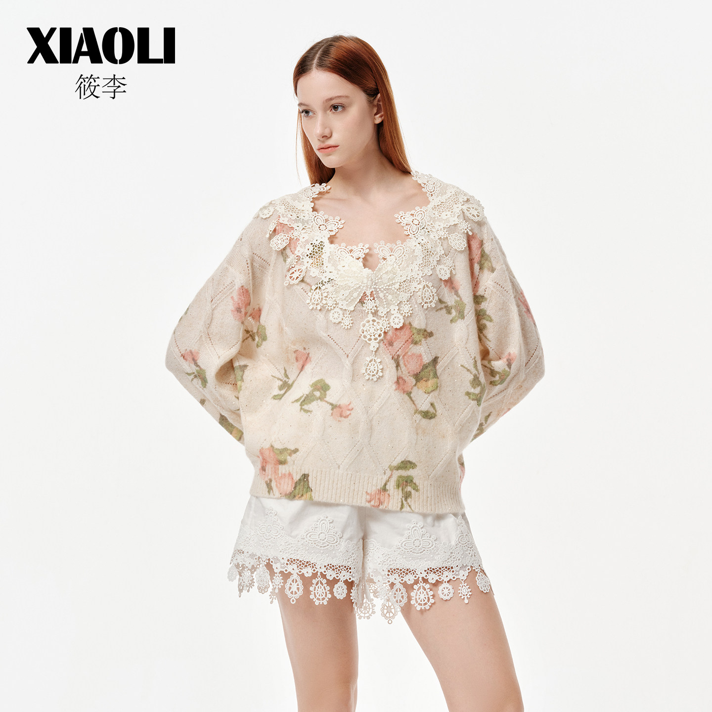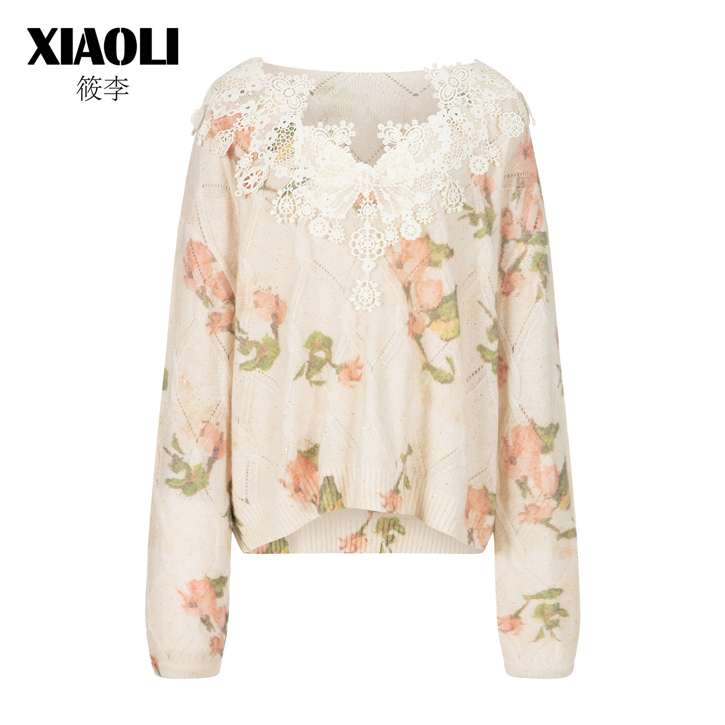 XIAOLI筱李2026年春季新品印花海军领蕾丝V领丝羊绒珠片针织毛衣