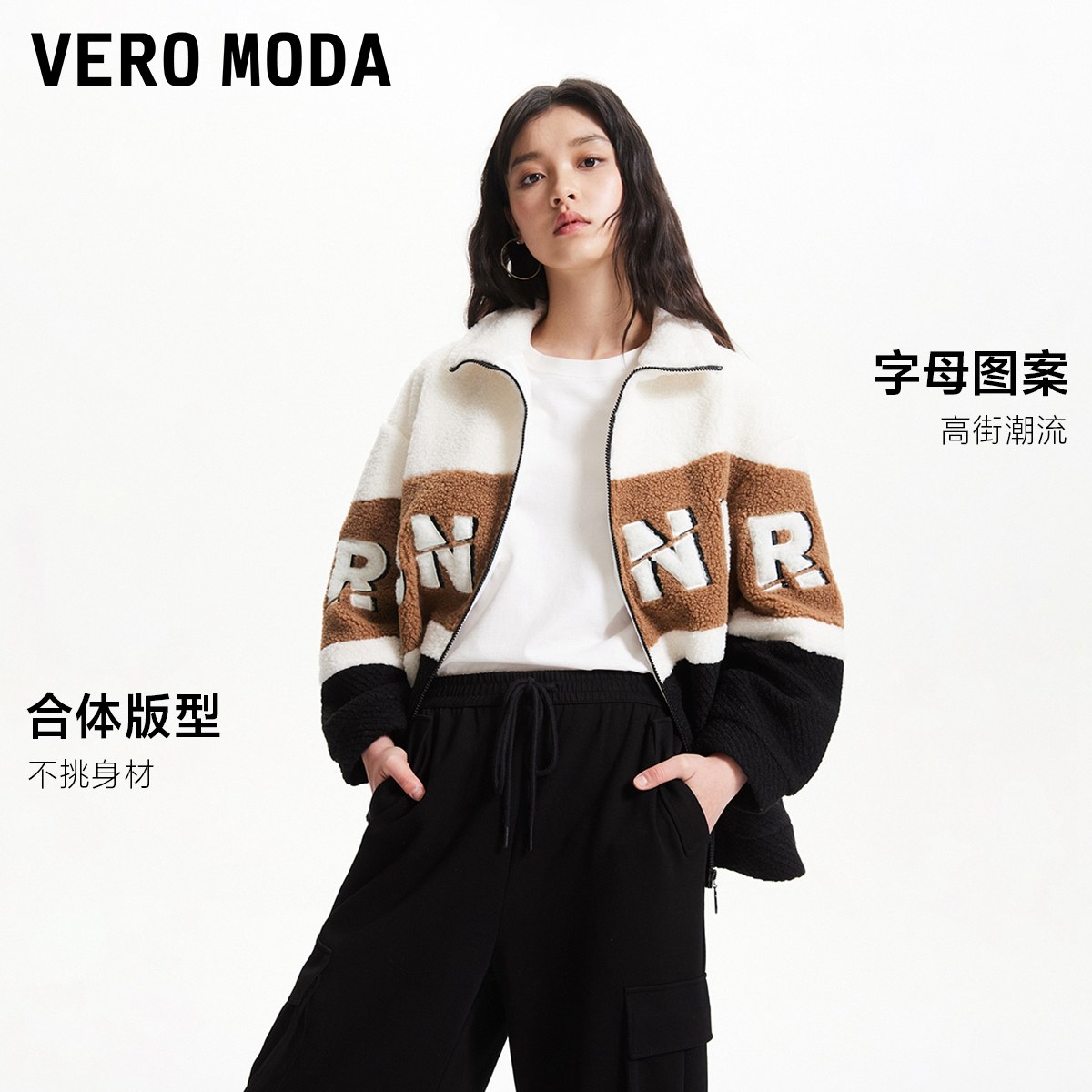 Vero Moda奥莱外套女秋季新款高街学院风休闲拼色泰迪熊夹克大衣