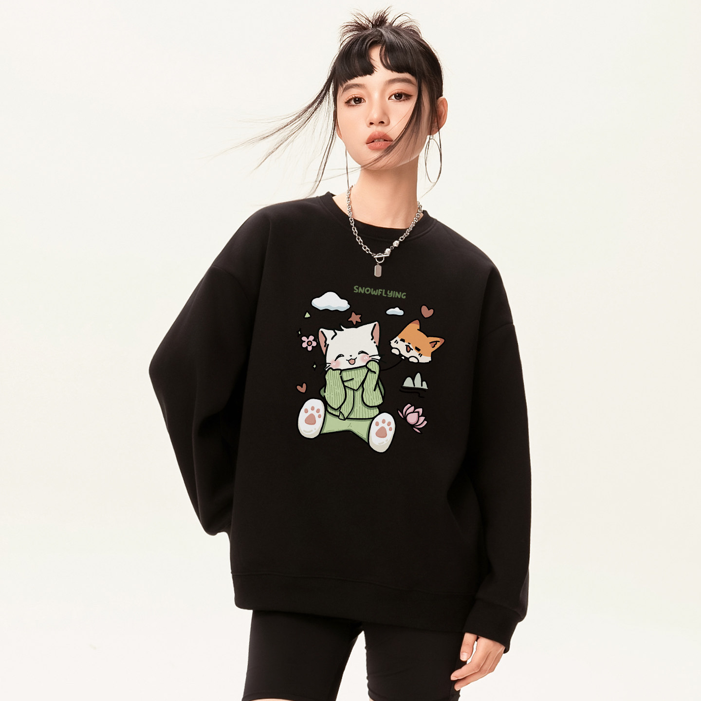 雪中飞绿色卫衣女冬季加绒加厚2025新款初中生猫咪印花套头外套PC