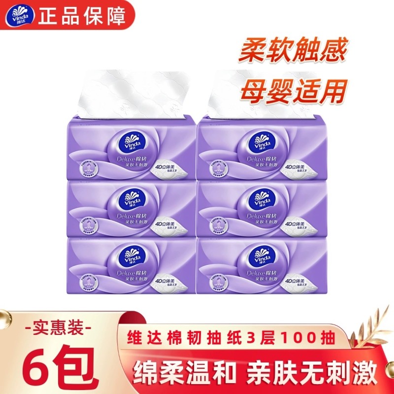维达棉韧抽纸100抽6包压花3层大包卫生纸面巾纸餐巾纸抽超韧餐桌