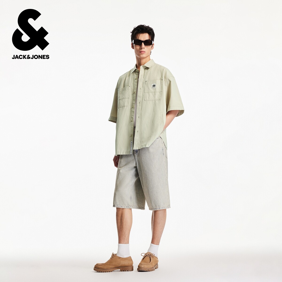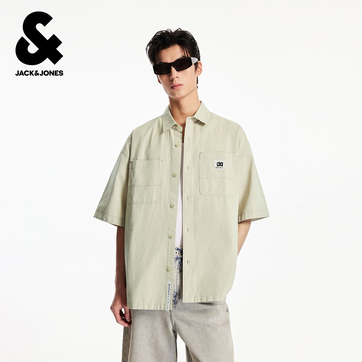 杰克琼斯男装春季衬衫纯棉舒适字母贴布中性简约胶印翻领短袖上衣