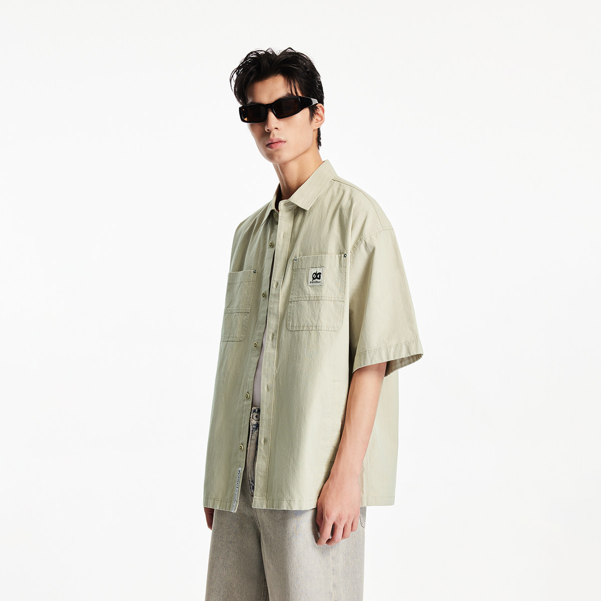 oversized版型、尖领、纽扣门襟、双侧贴袋