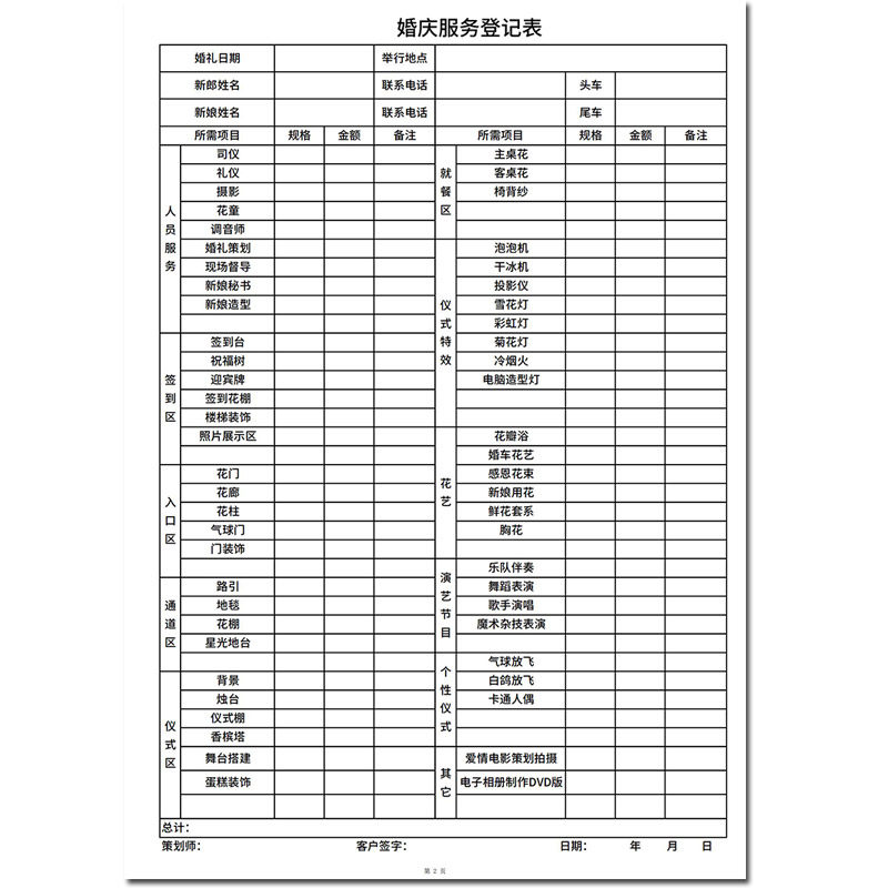 婚庆服务登记表婚礼用品记录本婚礼策划流程婚庆礼仪策划信息登记