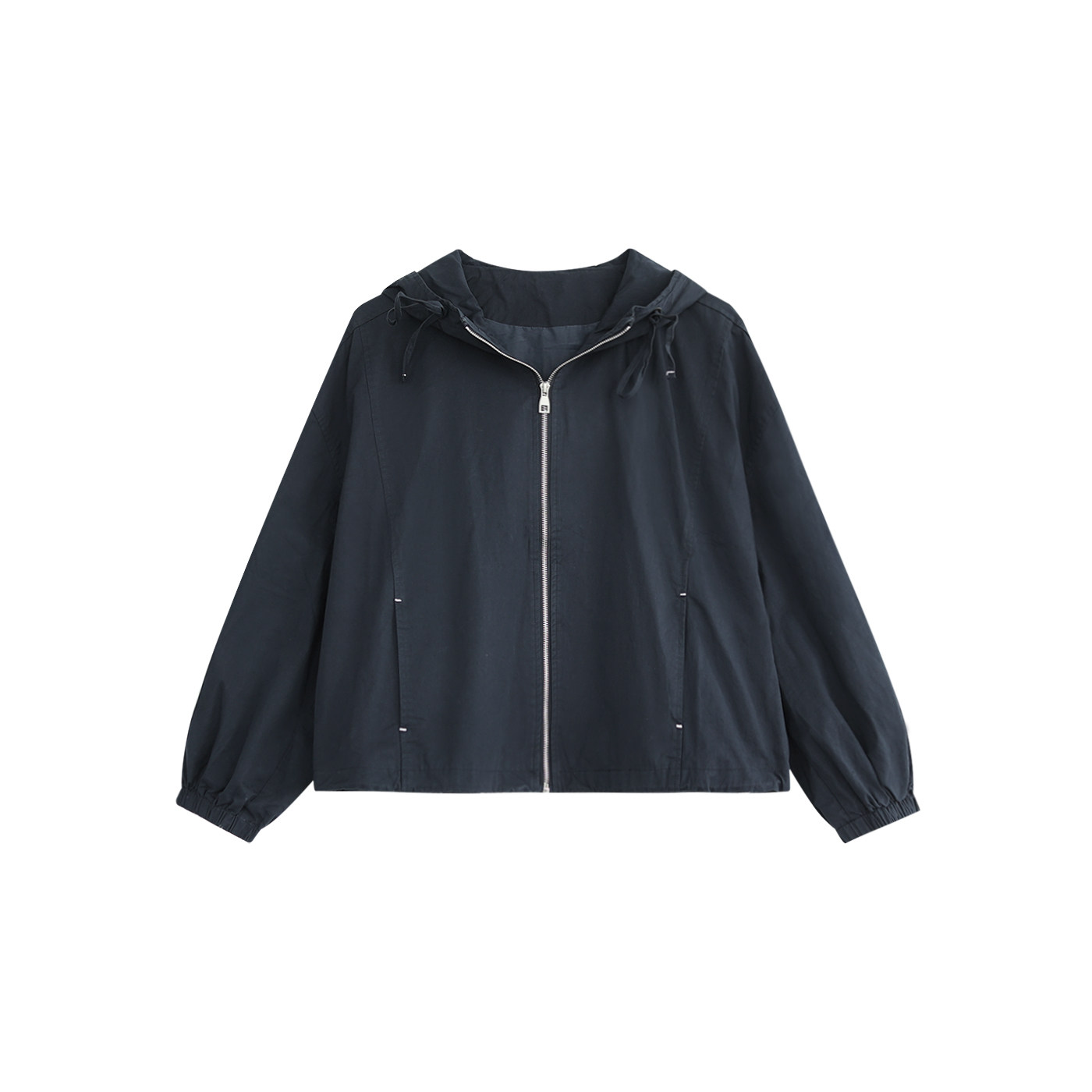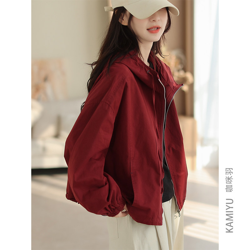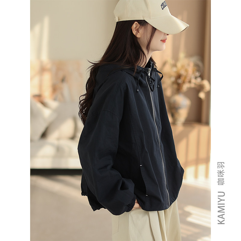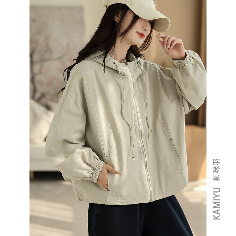 咖咪羽秋款复古高密连帽短风衣外套女秋季时尚抽绳拉链夹克女