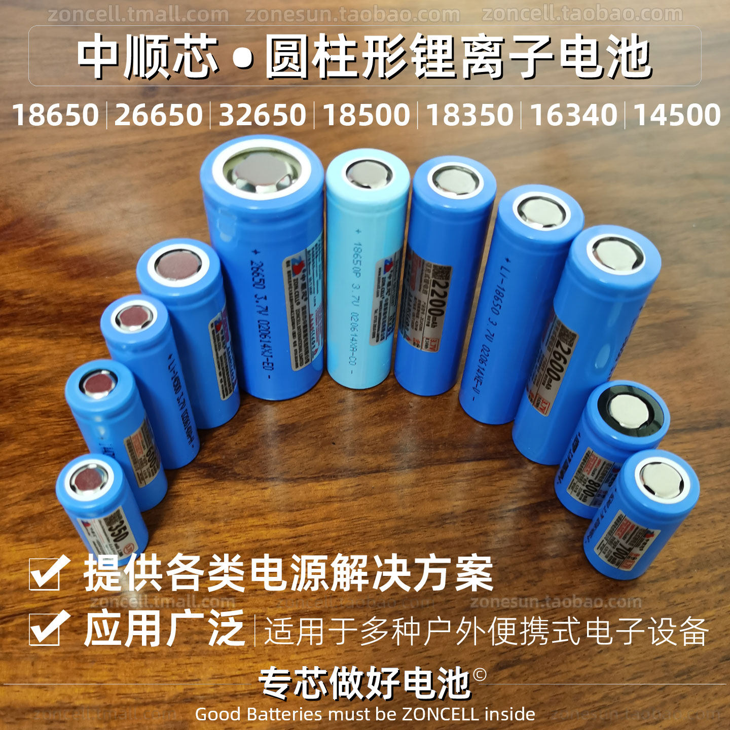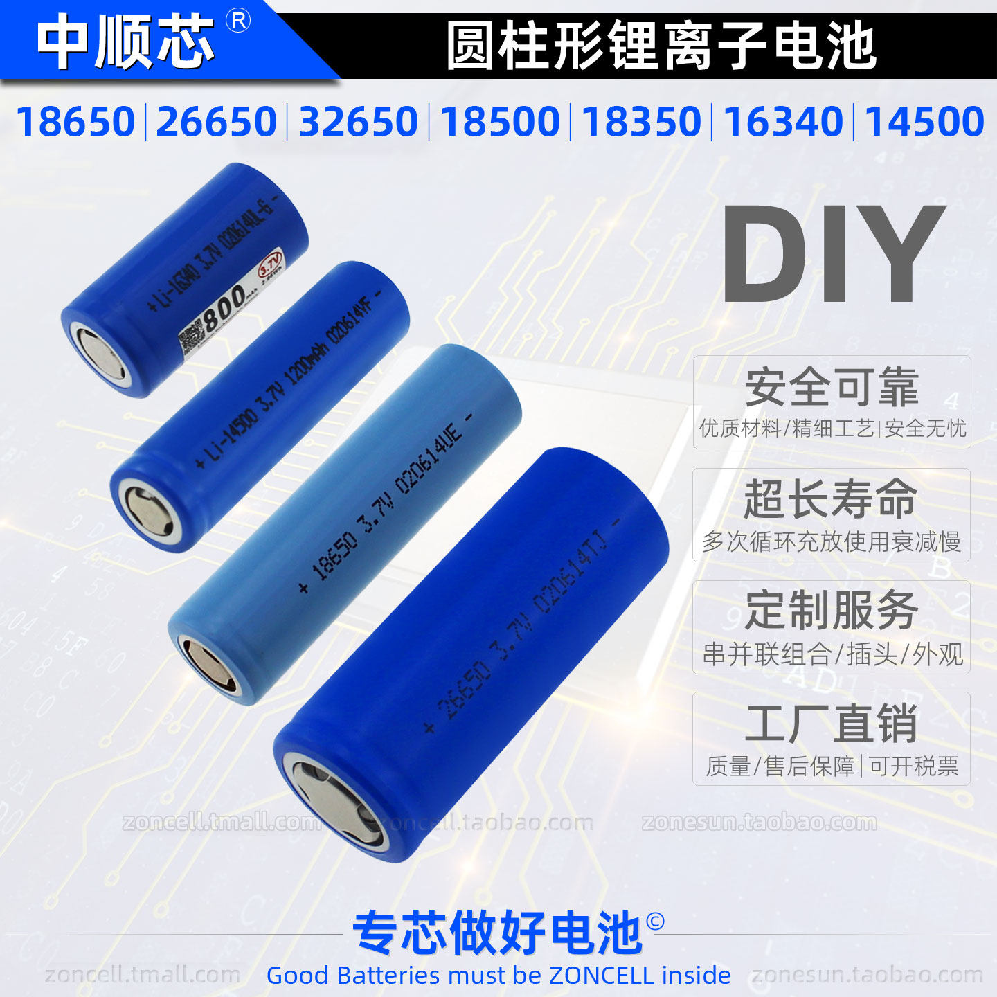 中顺芯3.7V圆柱形锂离子电池3.6V 18500 26650 16340 14500 18350