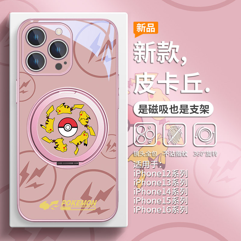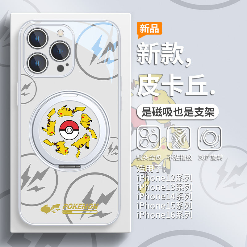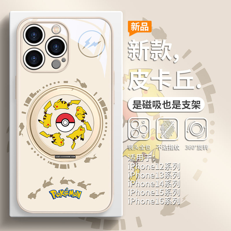 宝可梦适用华为iPhone16皮卡丘手机壳磁吸苹果15promax带支架14plus简约13pro创意12不会撞壳pura80支点壳70