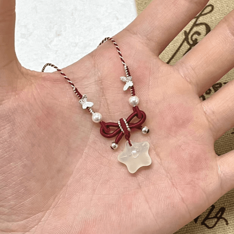 「小蝴蝶」冰透珍珠点缀酒红色小星星项链个性可爱新中式新款颈链