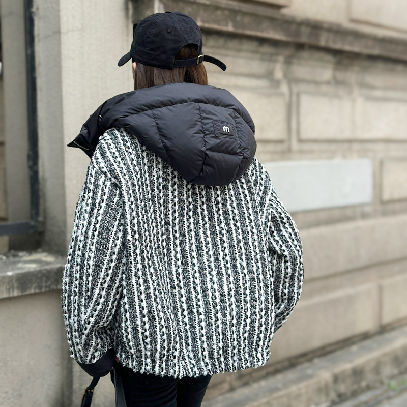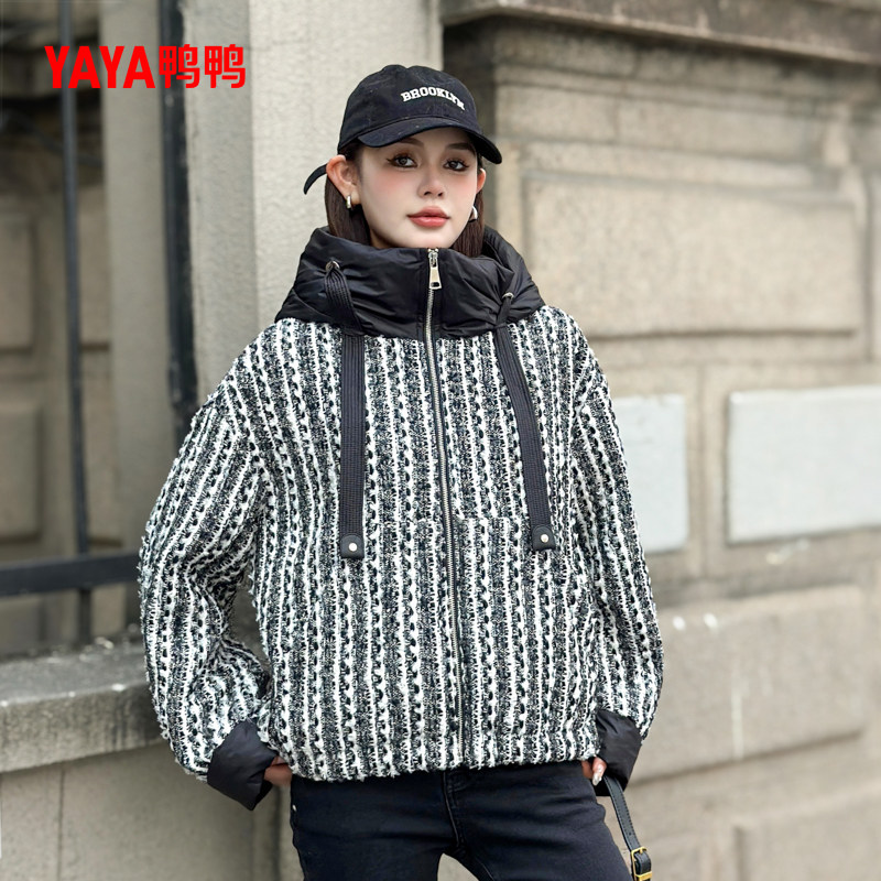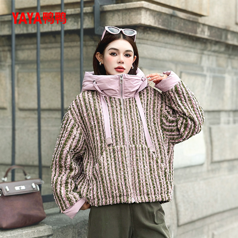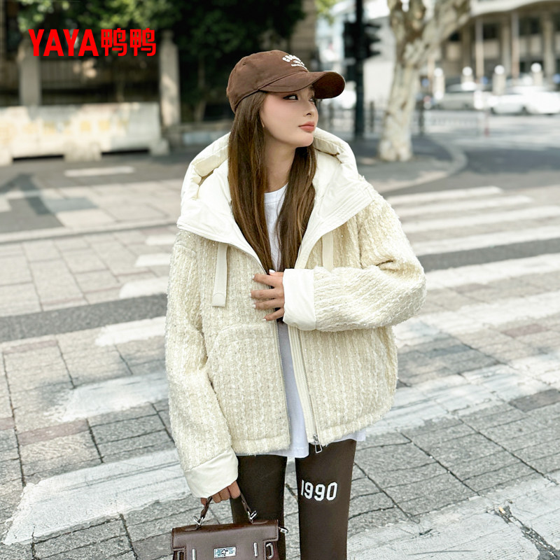 鸭鸭YAYA羽绒服女冬2025新款短款宽松连帽设计感小香风粗花呢外套