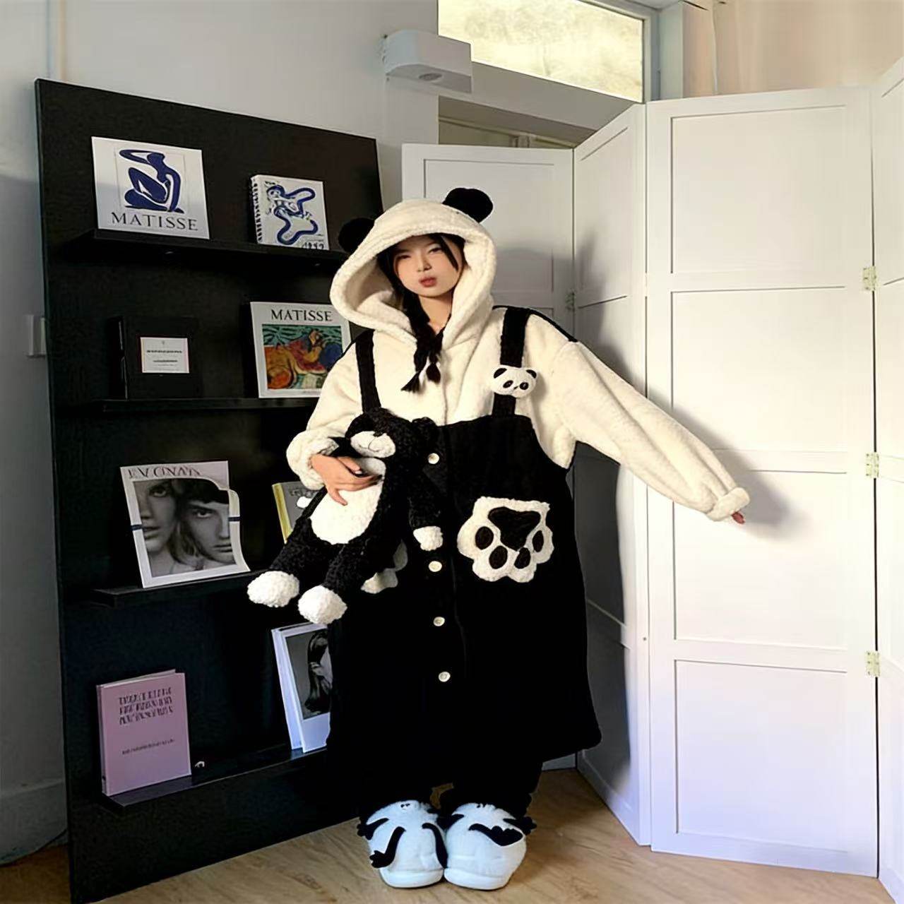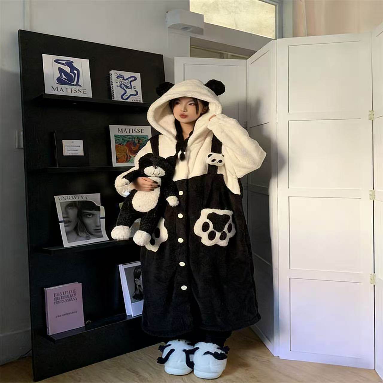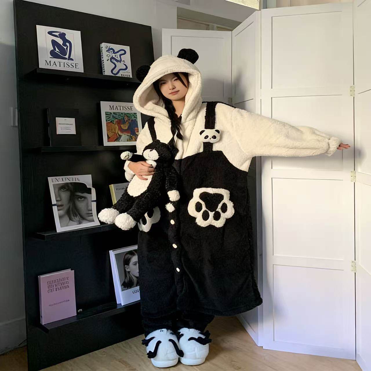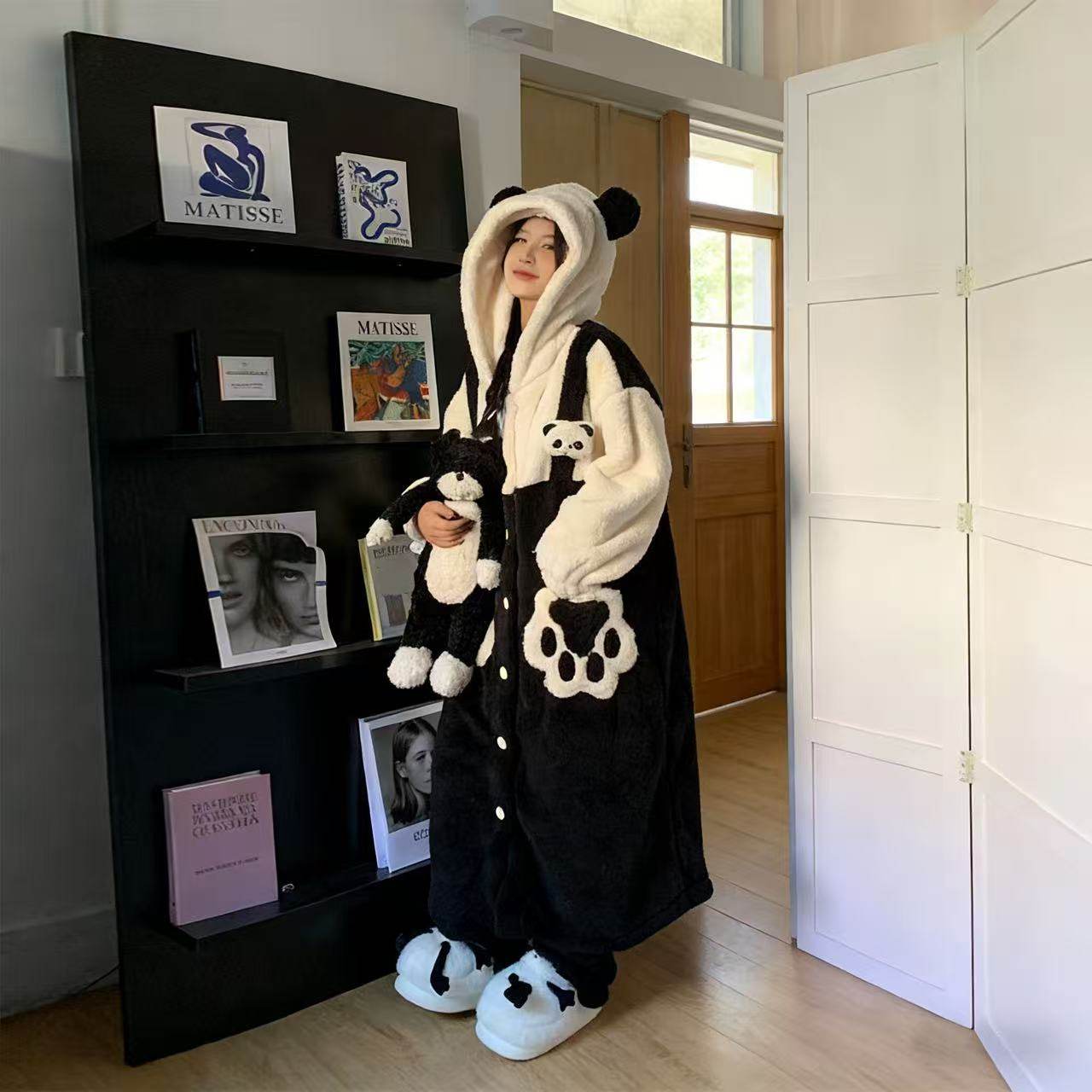 缇可爱熊猫珊瑚绒睡衣女冬款新款加绒加厚毛绒睡袍家居服套装黑色