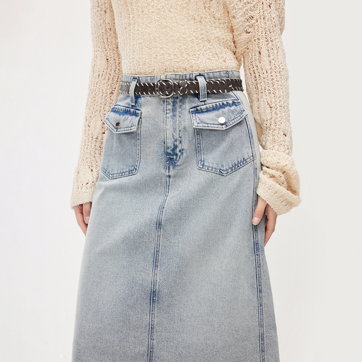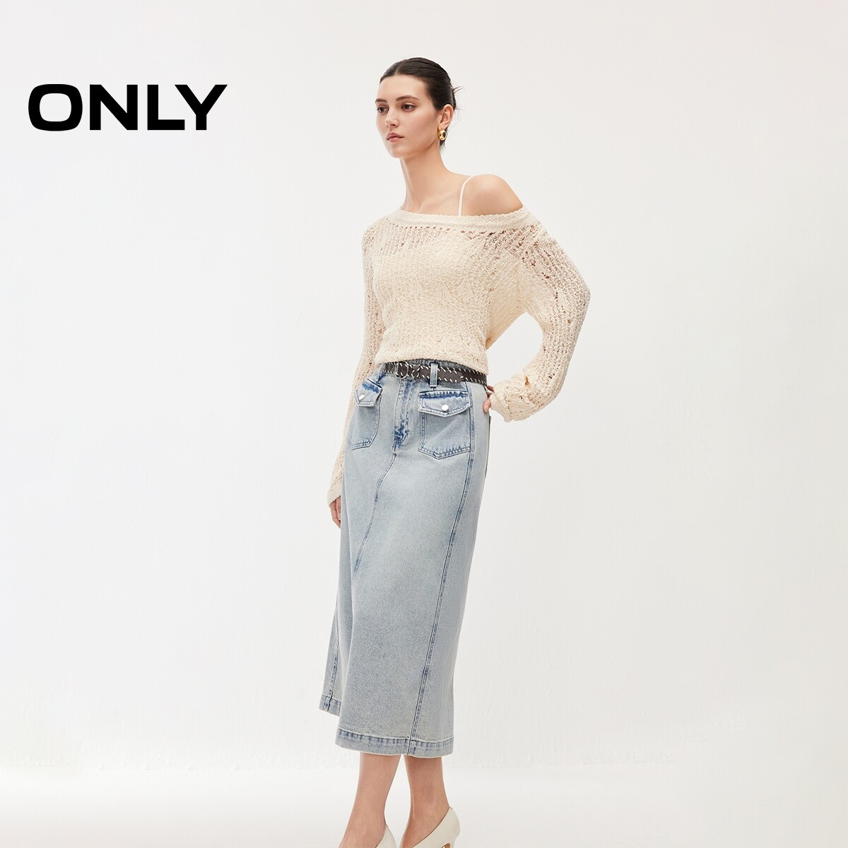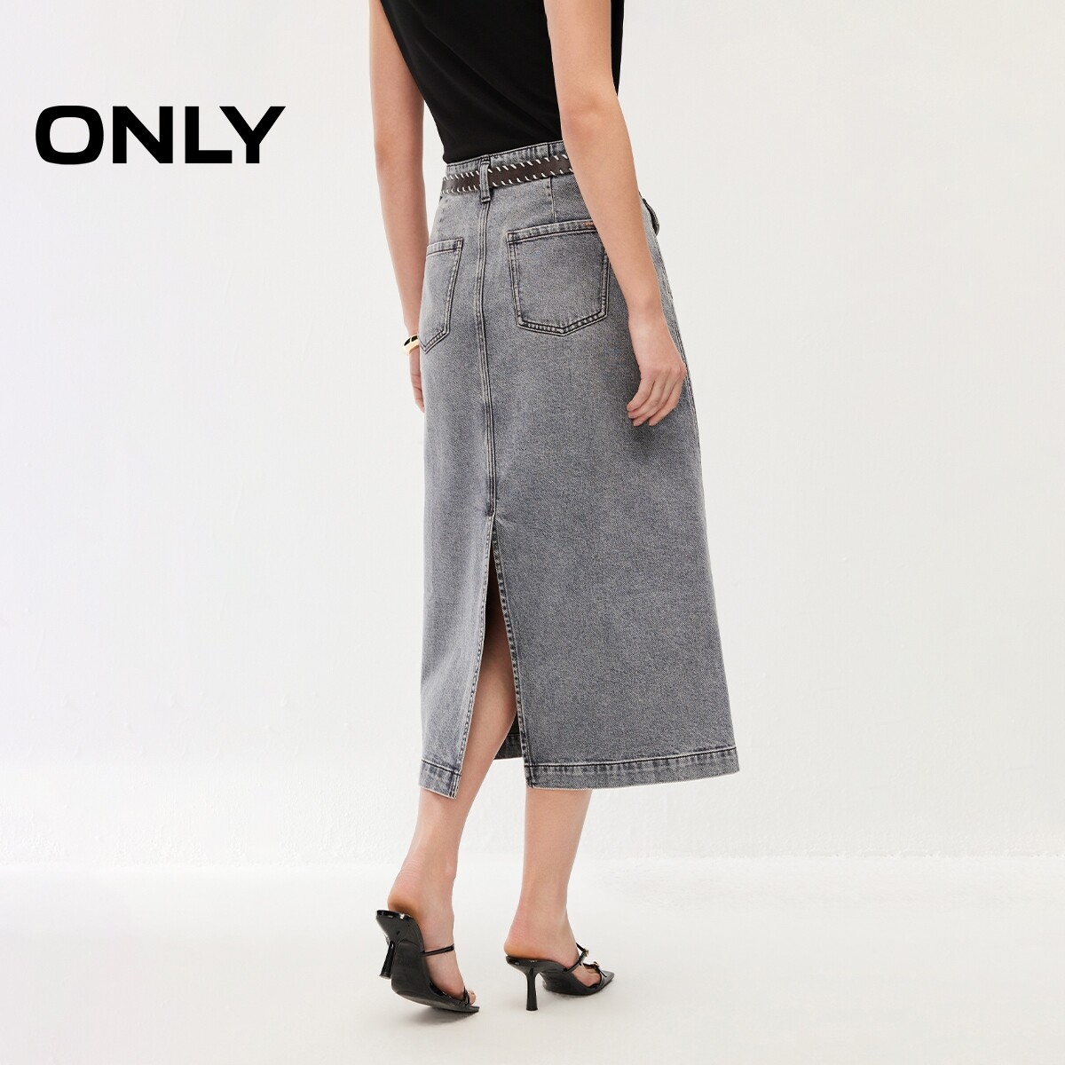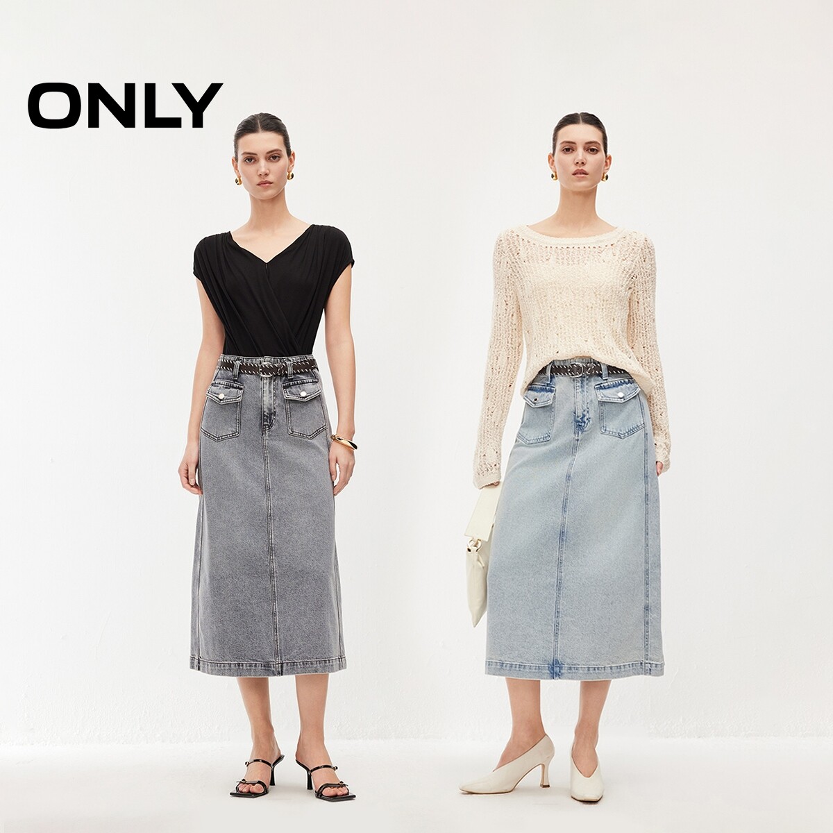 ONLY2026春季新款复古水洗实用口袋开衩高腰A字伞裙牛仔半身裙女