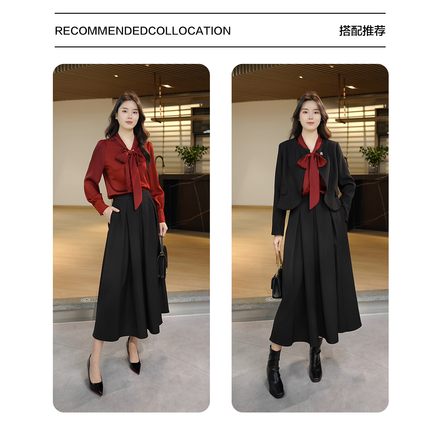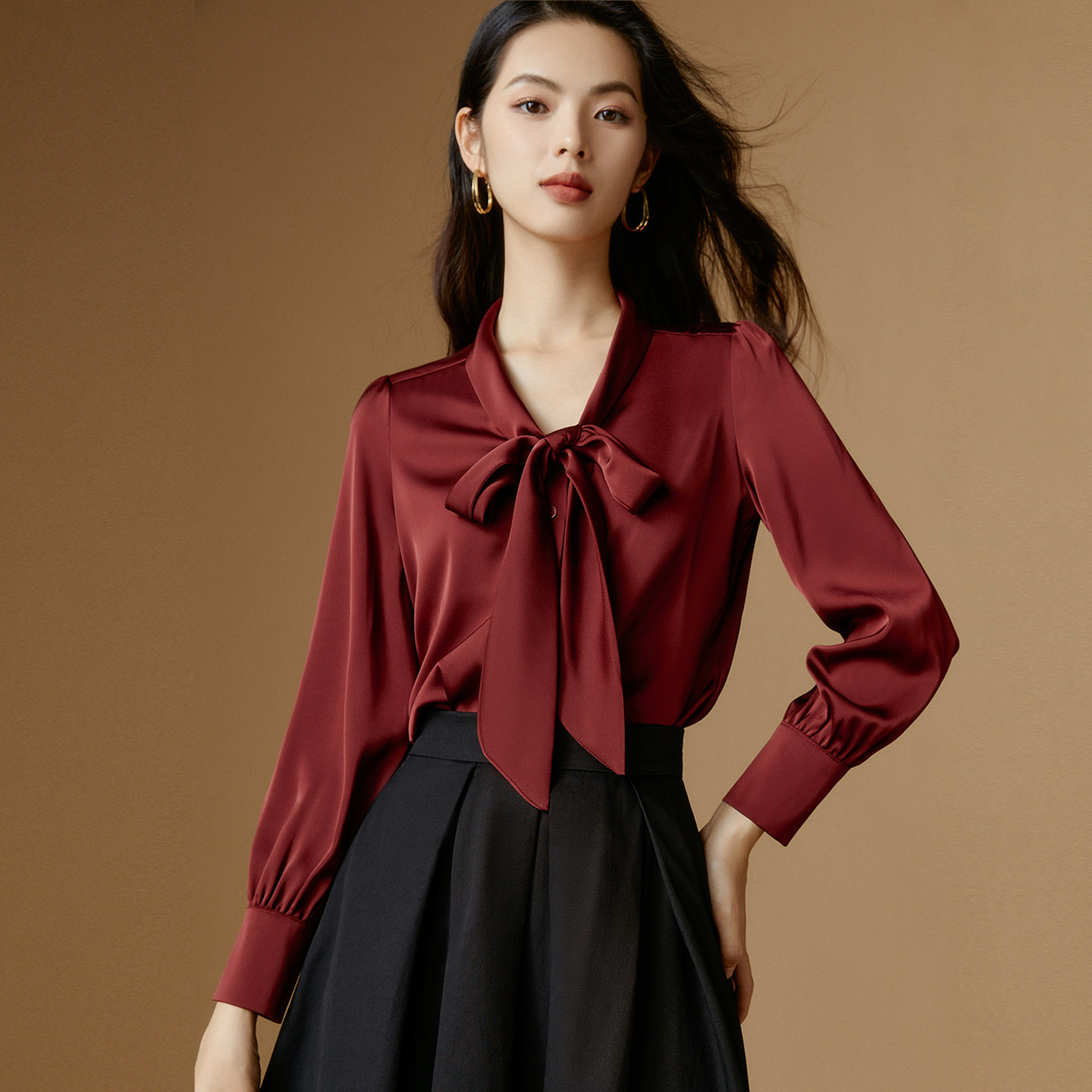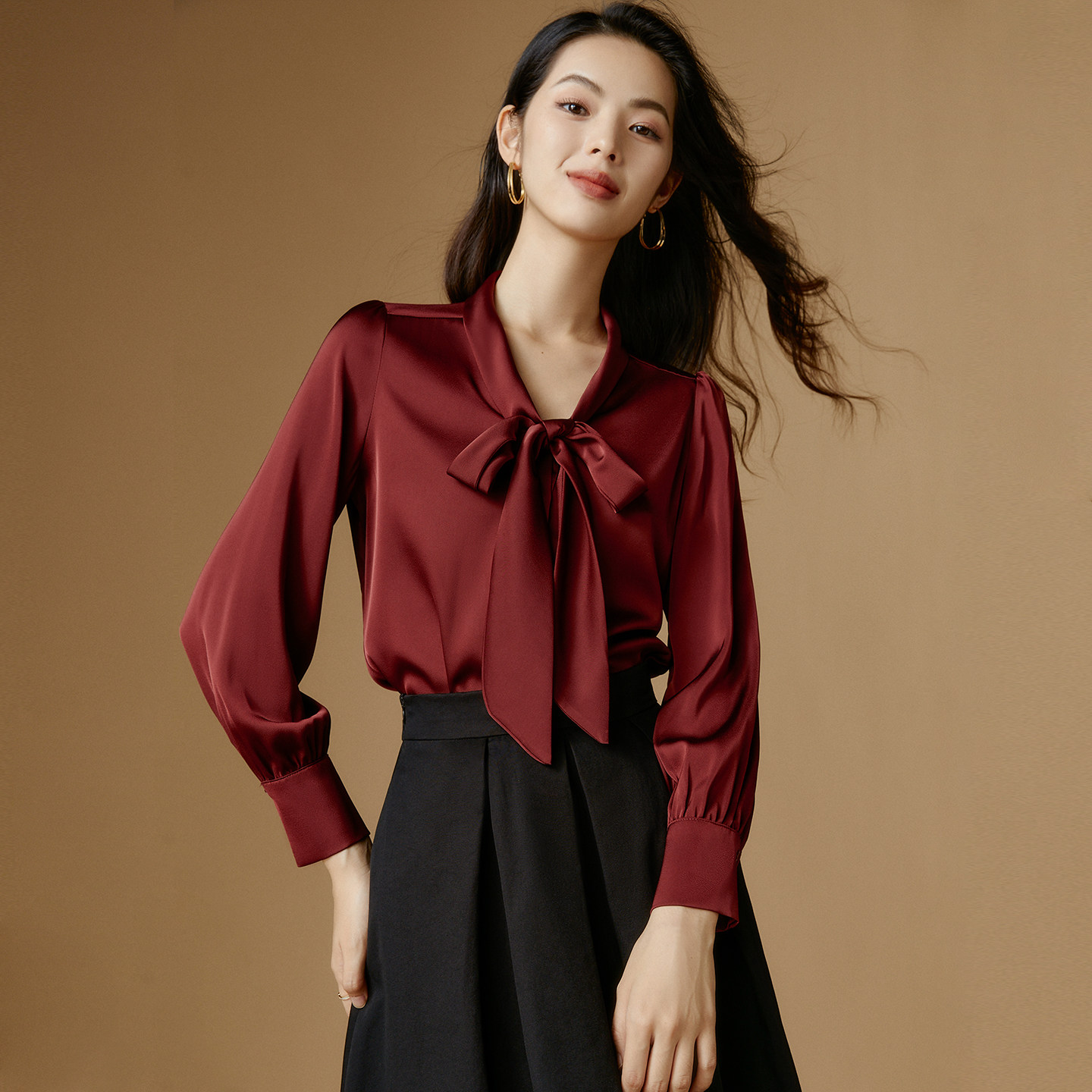 晚白红色衬衣春装新款女装高端缎面洋气蝴蝶结通勤衬衫女别致上衣