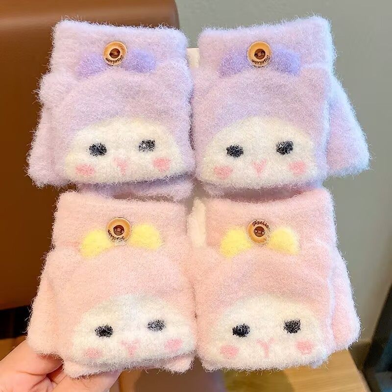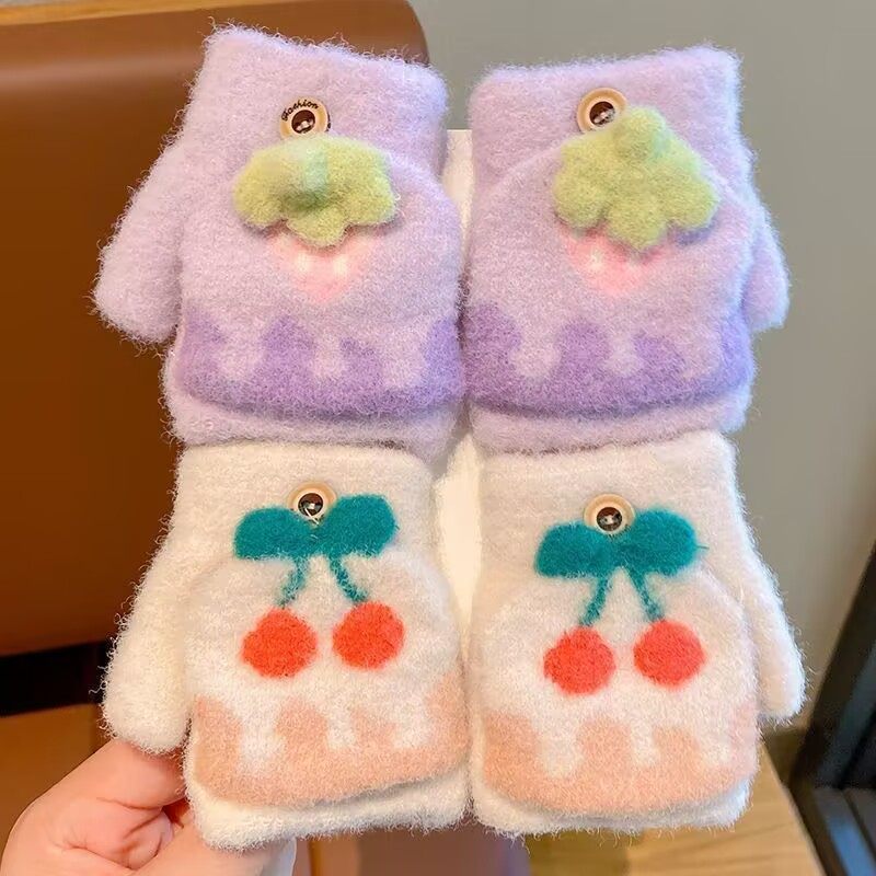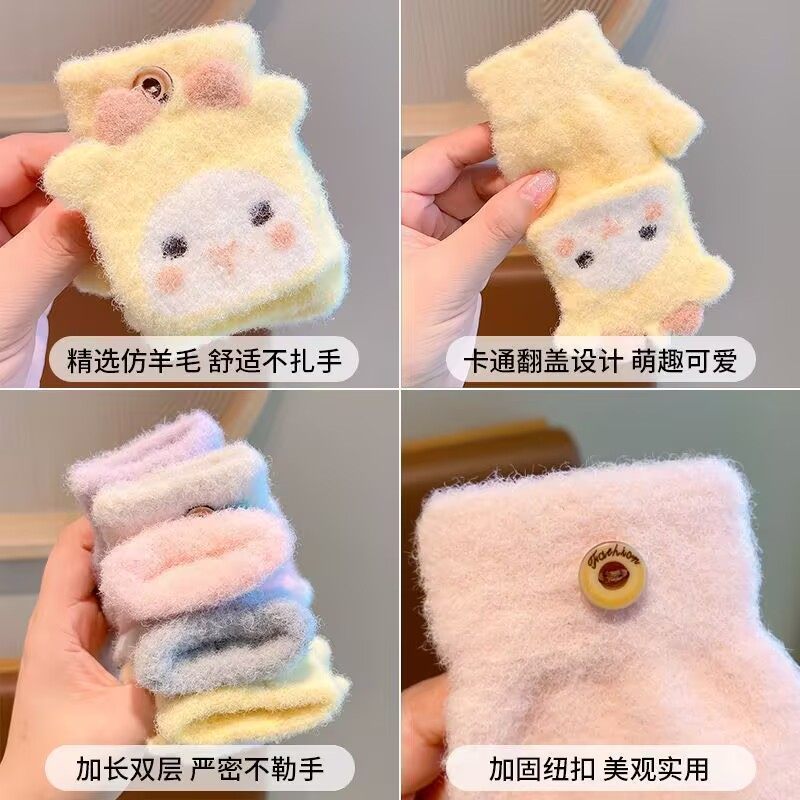 冬季儿童手套女孩可爱翻盖五指套男孩写字防寒保暖半指套草莓兔子