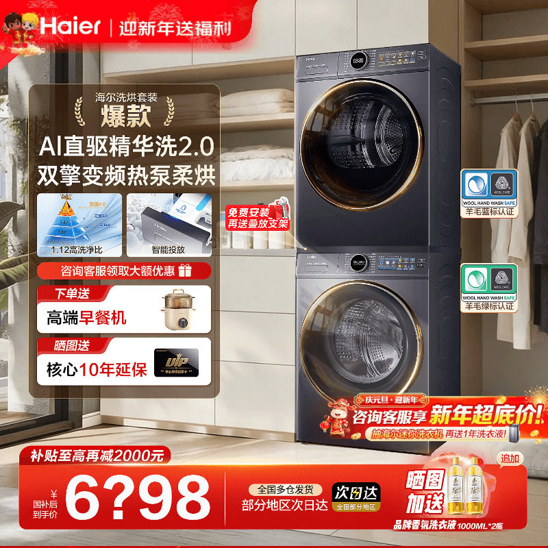 【云溪4.0】海尔77E洗烘套装直驱滚筒洗衣机热泵烘干机官方旗舰店