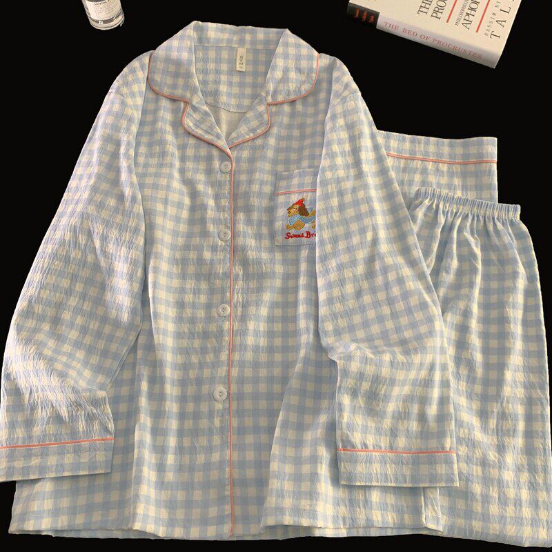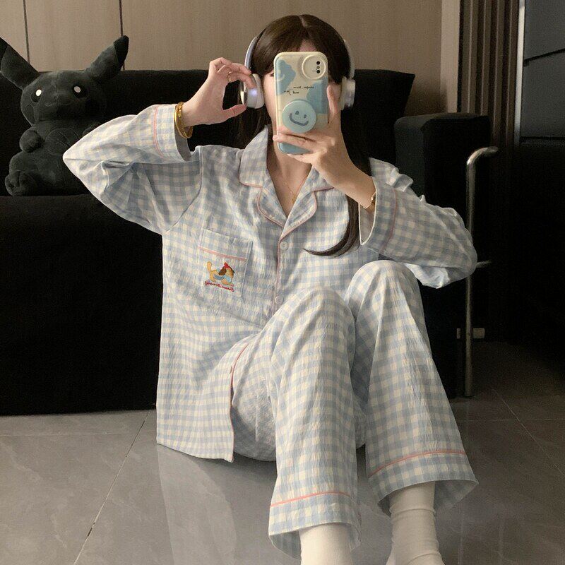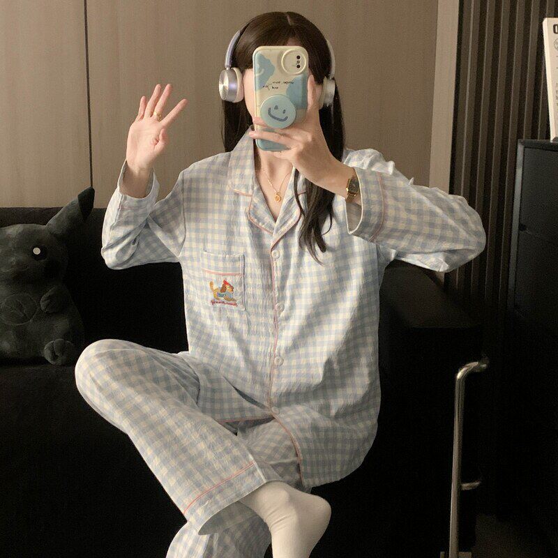 红豆日系奶腊肠小狗大码睡衣女春秋长袖云朵纯棉纱可爱家居服格子