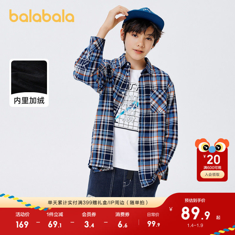 巴拉巴拉童装男童衬衫长袖加绒中大童格子印花衬衣洋气上衣潮休闲