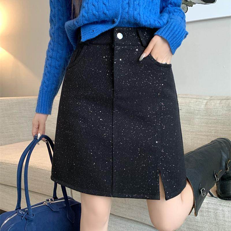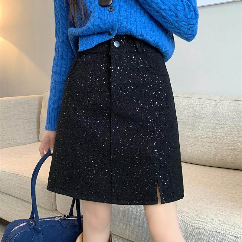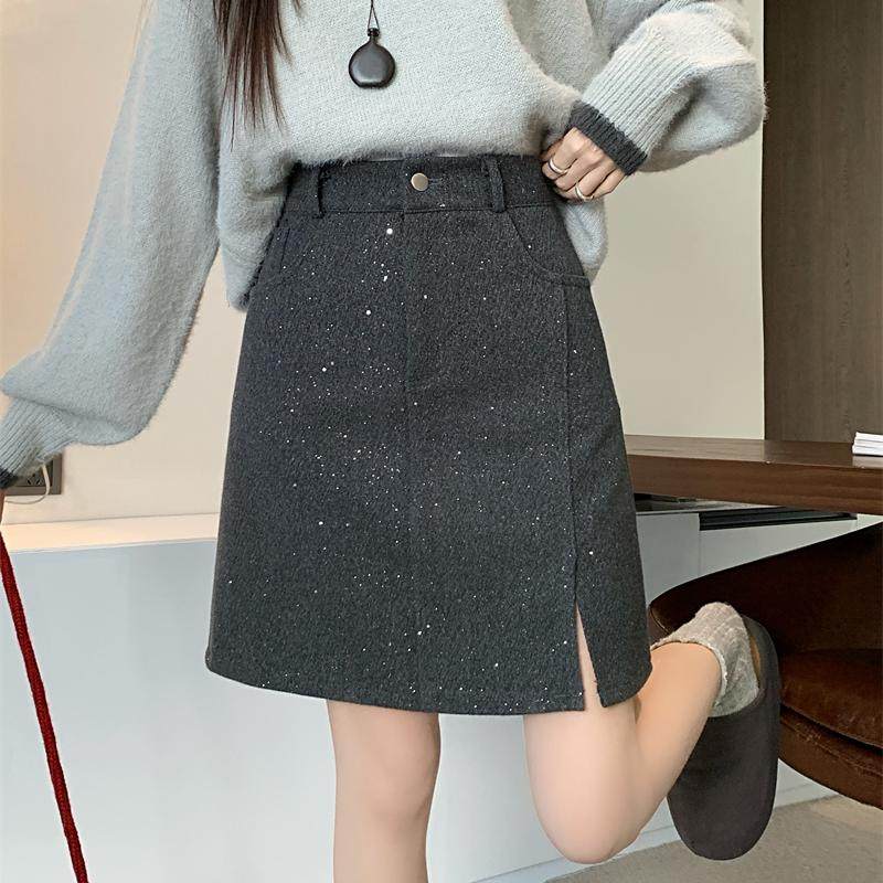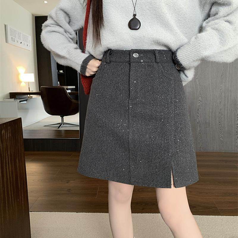 大码闪闪开叉半身裙女秋冬高腰亮片a字短裙加厚毛呢灰色包臀中裙
