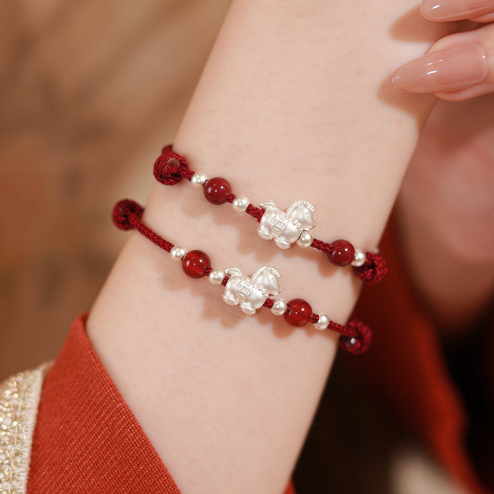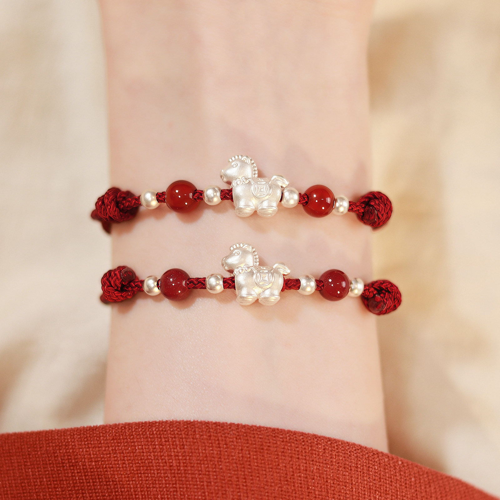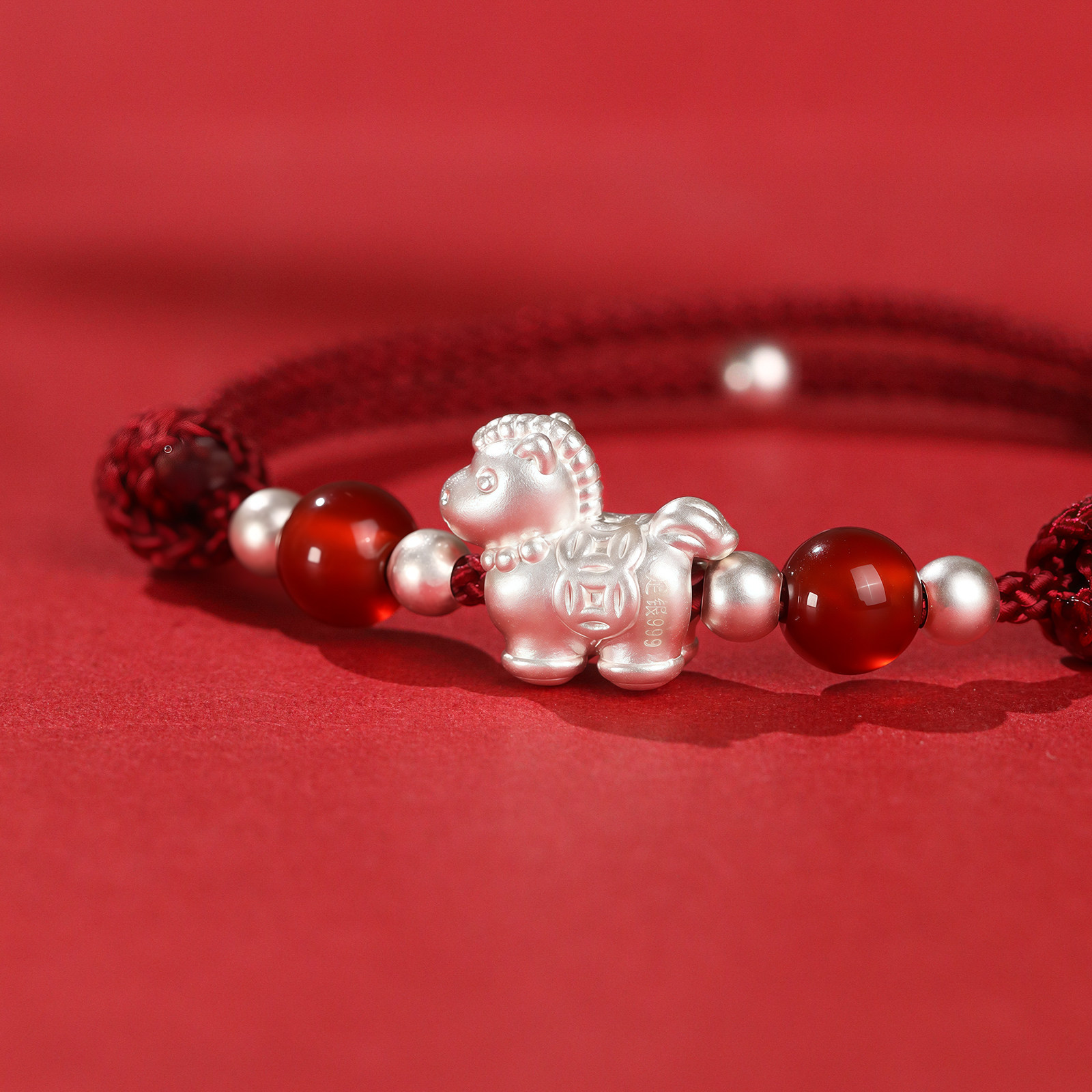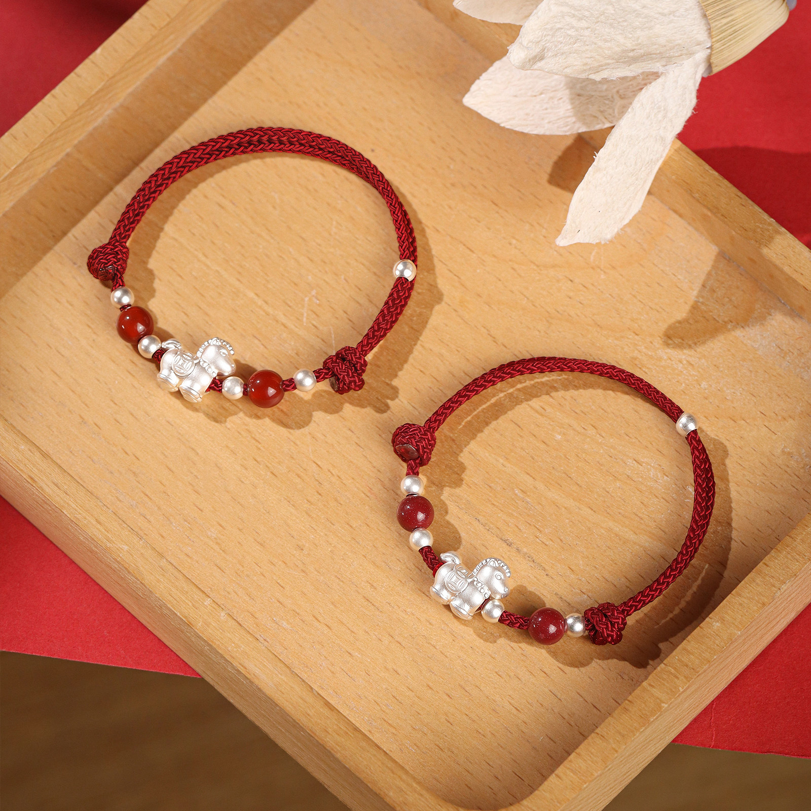 骏足银999马本命年红手绳生肖马红玛瑙朱砂红绳手链编织转运珠