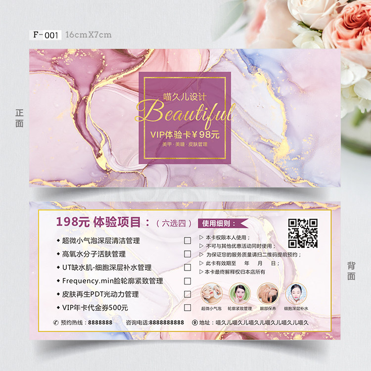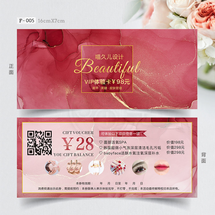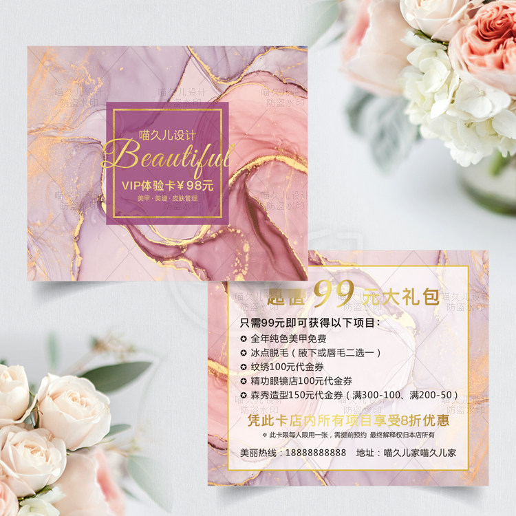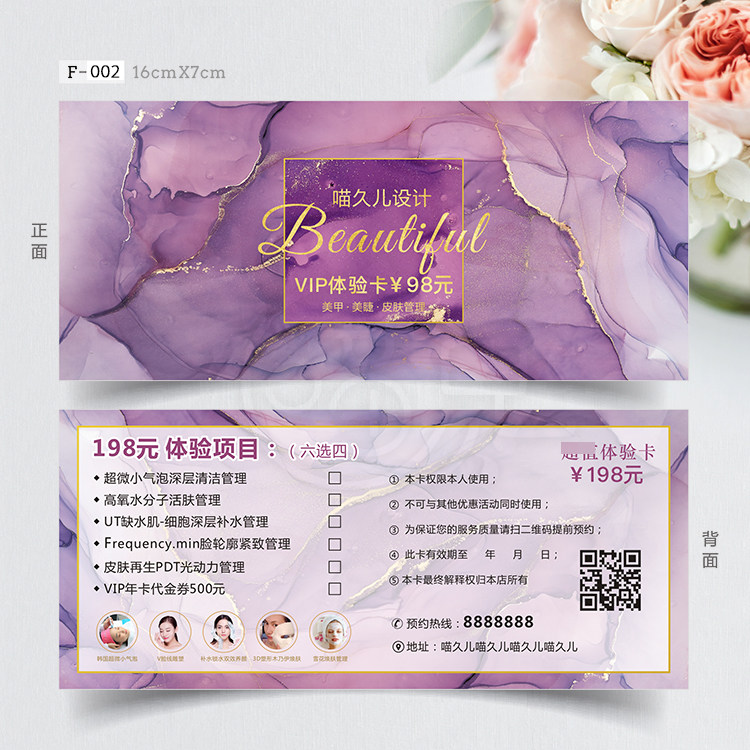 紫色高档金色花水纹美甲美睫皮肤管理半永久抵用券优惠代金券定制