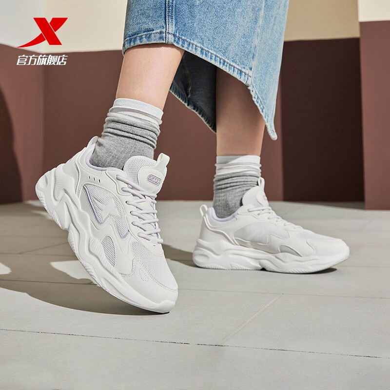 特步星火休闲鞋女鞋冬季革面正品厚底轻便运动鞋复古跑步鞋老爹鞋