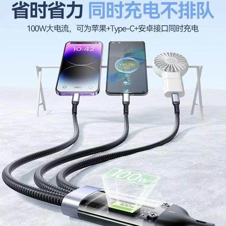 新款100w三合一快充数据线车载超闪充苹果华为安卓通用充电器多头