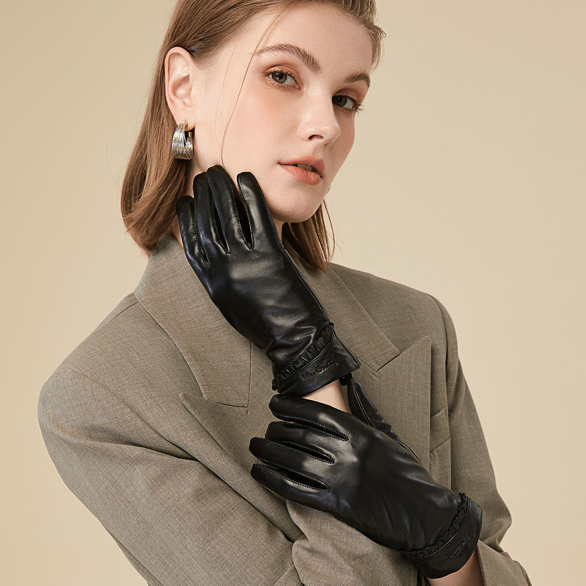 皮尔卡丹女士羊皮手套冬季开车骑行防寒加厚保暖触屏女式真皮手套