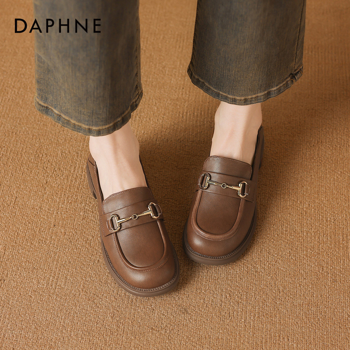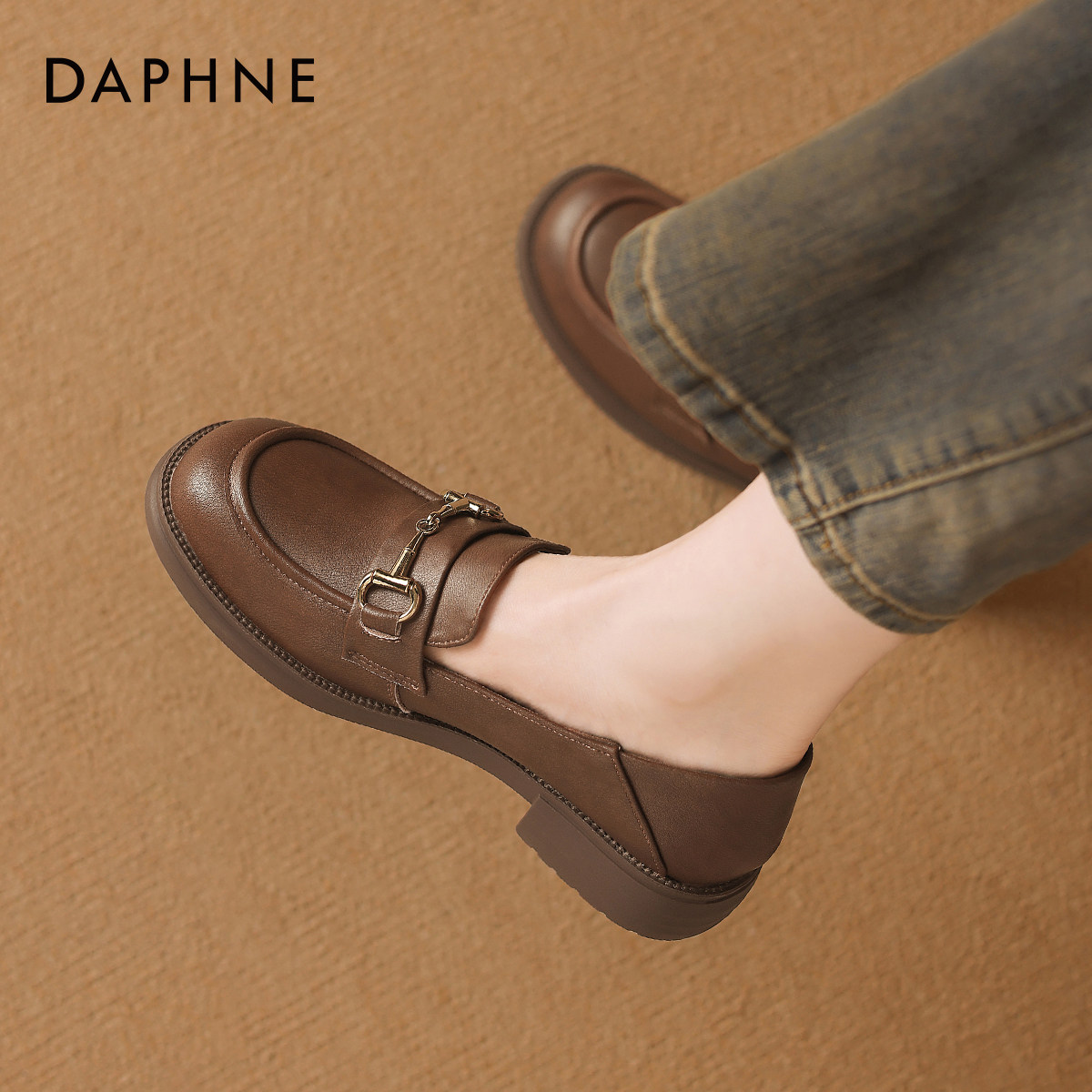 羊皮~棕色山茶花乐福鞋女2025新款通勤粗跟单鞋百搭英伦风小皮鞋