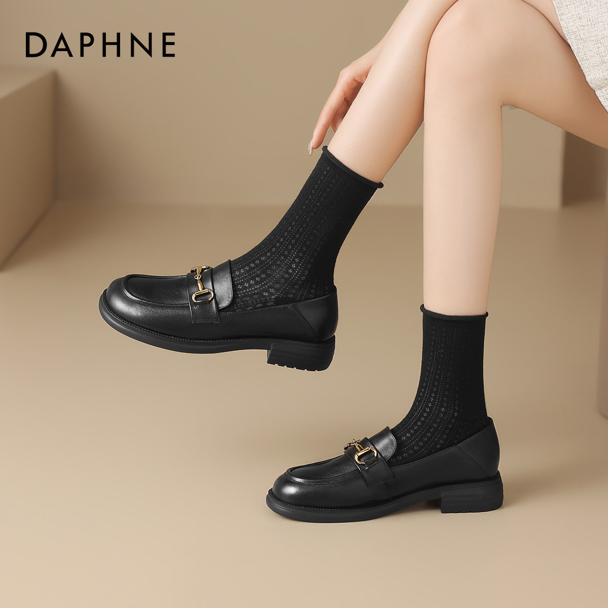 达芙妮黑色一脚蹬乐福鞋2026新款春季女款英伦风豆豆小皮鞋女鞋子