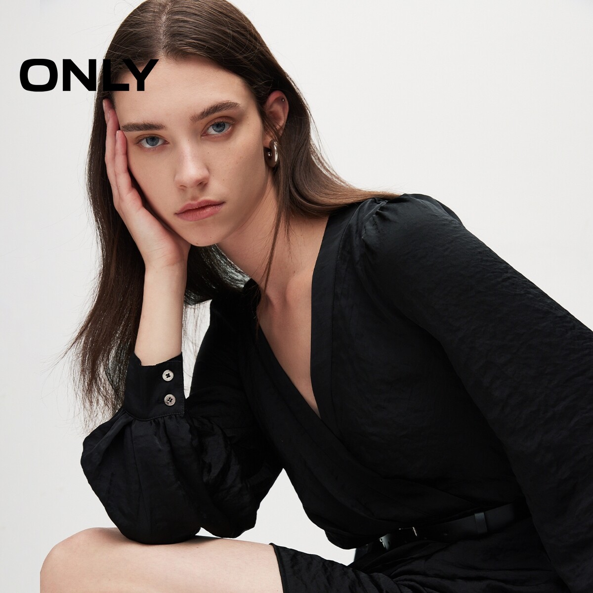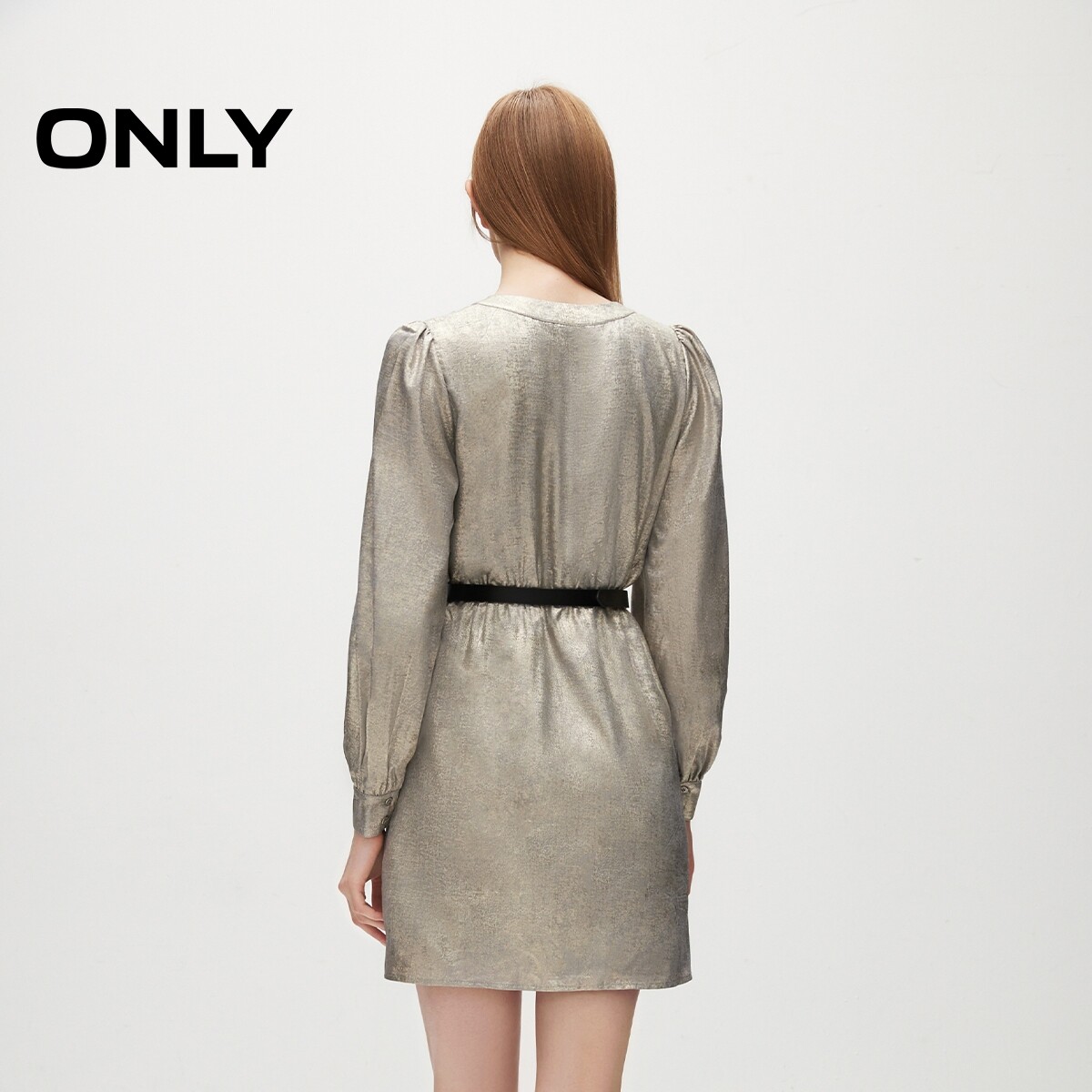 【ONLY奥莱】春季新款通勤V领收腰泡泡袖长袖短裙连衣裙女
